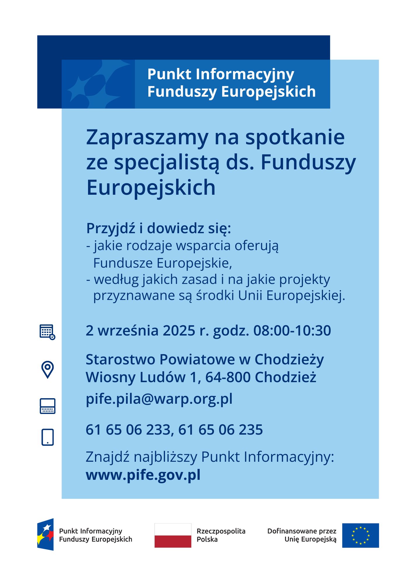 uprzejmie informuję, że Punkt Informacyjny Funduszy Europejskich w Pile organizuje w dniu 02.09.2025 r. Mobilny Punkt Informacyjny w: