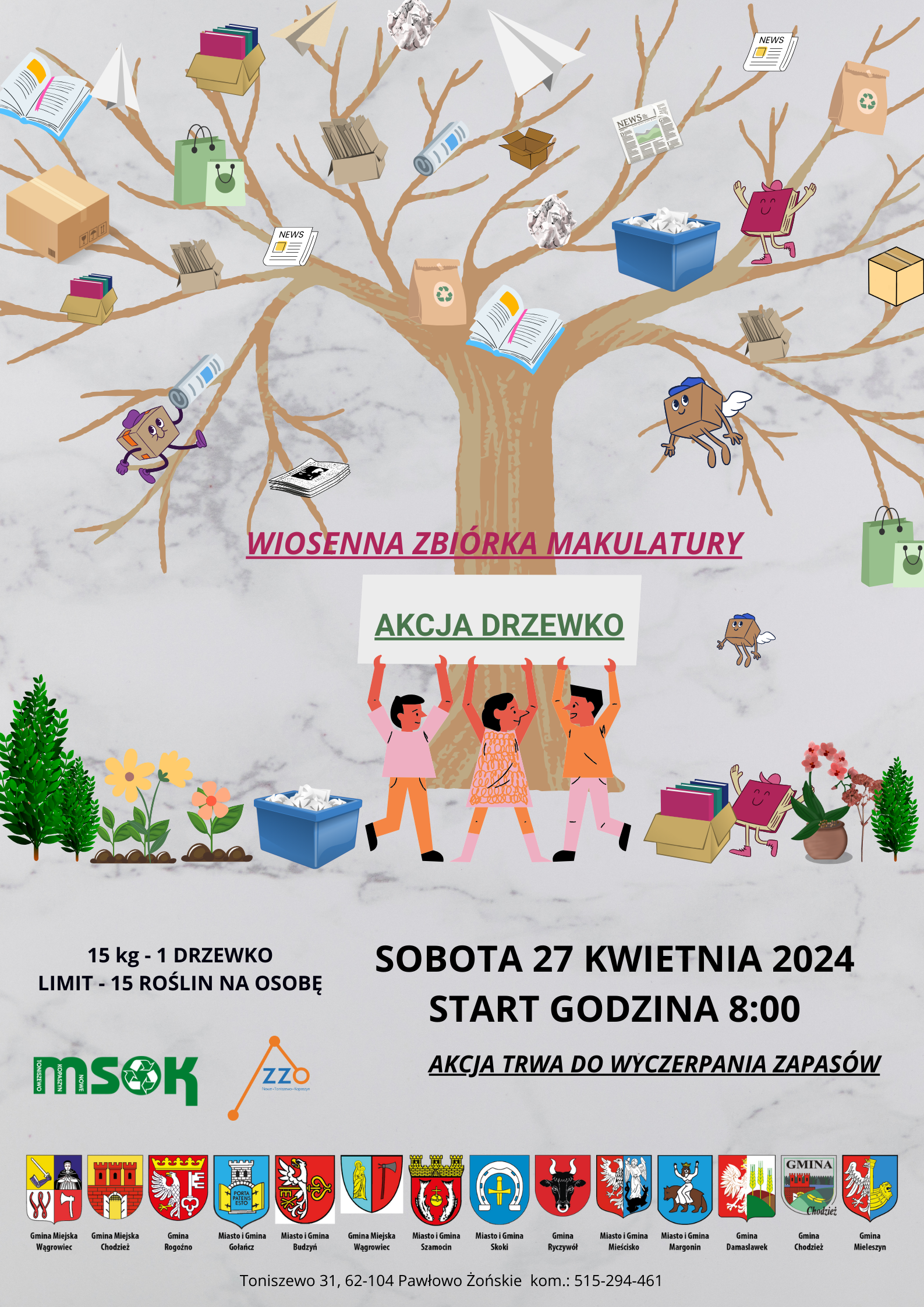 Akcji PAPIER DASZ DRZEWKO MASZ, odbędzie się 27 kwietnia 2024 r. o godzinie 8:00. Za każde 15 kg makulatury można otrzymać 1 drzewko, limit na 1 osobę to 15 roślin.