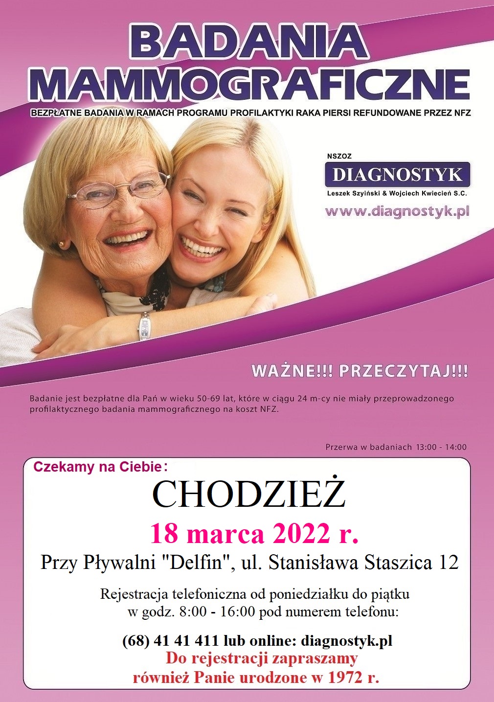 W związku z postojem naszego mammobusu, zachęcamy wszystkie Panie w wieku 50-69 lat do BEZPŁATNYCH BADAŃ MAMMOGRAFICZNYCH.