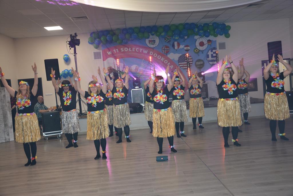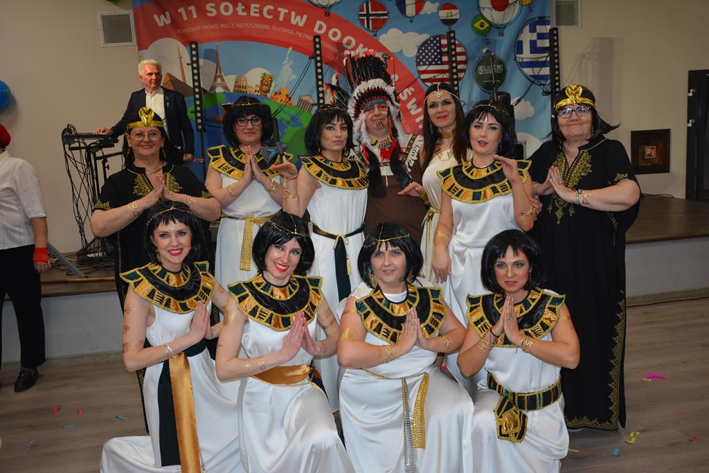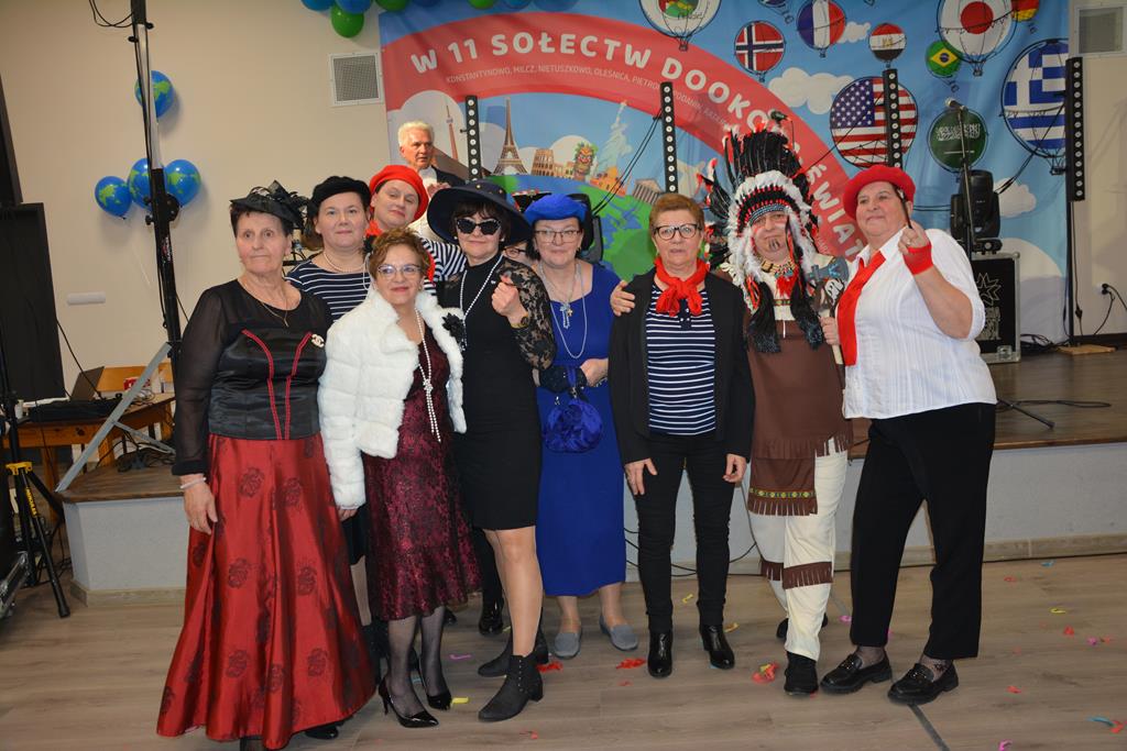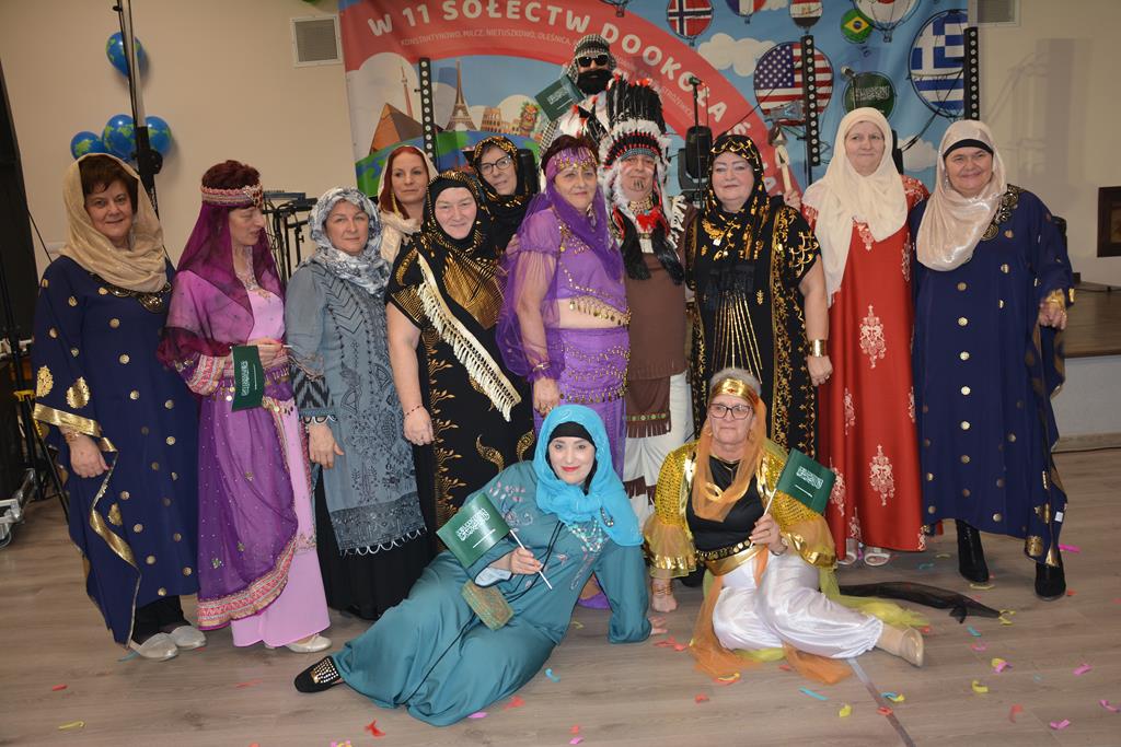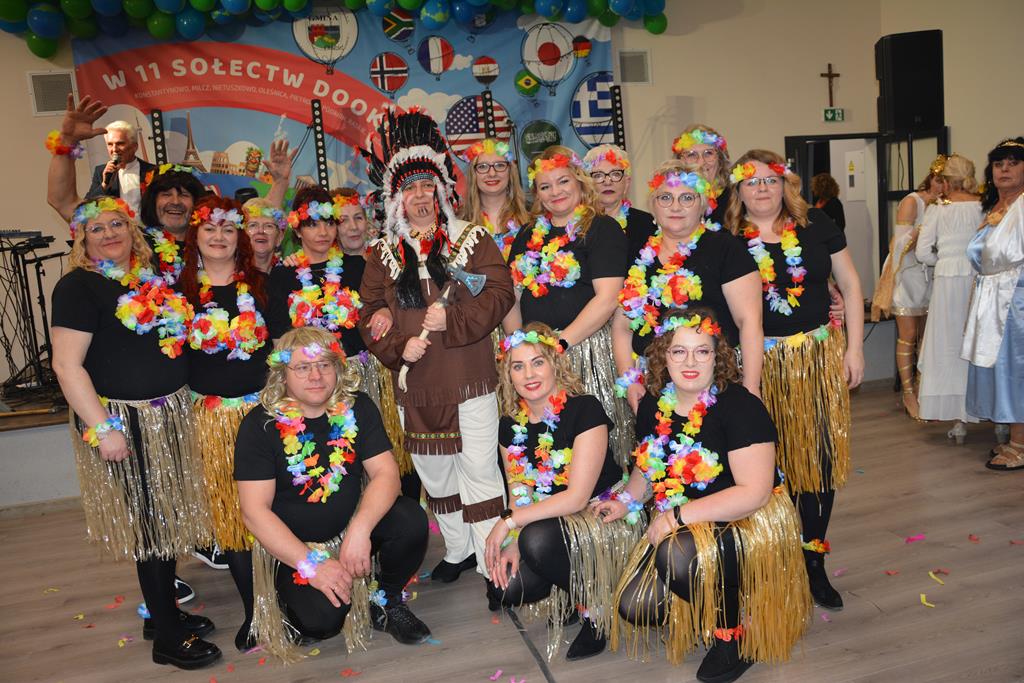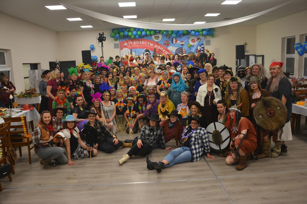 Świetnie przemyślane spotkanie to kolejny krok w kierunku integracji gminy. Tym razem władze gminy nawiązały do spotkania sprzed 3 lat pn. babski comber - głośnej wówczas poświęconej epoce średniowiecza imprezy, którą dosłownie na kilka dni przed ogłoszeniem pandemii udało się zorganizować. Teraz zamysł pomysłodawców był nieco inny, choć miał także równie edukacyjny charakter. 11 sołectw gminy uczestniczyło wcześniej w losowaniu, które decydowało jaki region lub kraj będą prezentowały. Efekty przeszły najśmielsze oczekiwania. W sali nie było nikogo(!), który by nie był ucharakteryzowany za mieszkańca, którejś z tych najbardziej malowniczych i popularnych destynacji. Zanim jednak zaczęły się prezentacje poszczególnych sołectw, do sali przygalopowała grupa kowbojek z jedną Indianką w efektownym pióropuszu, którą okazała się być wójt gminy i pomysłodawczyni imprezy Kamila Szejner.