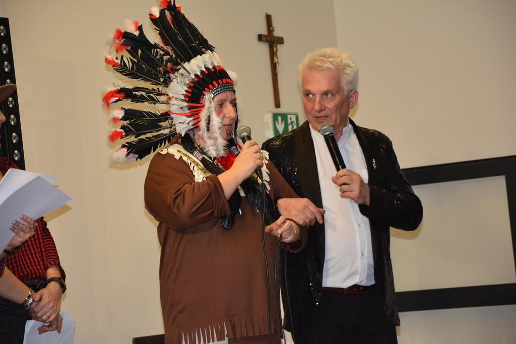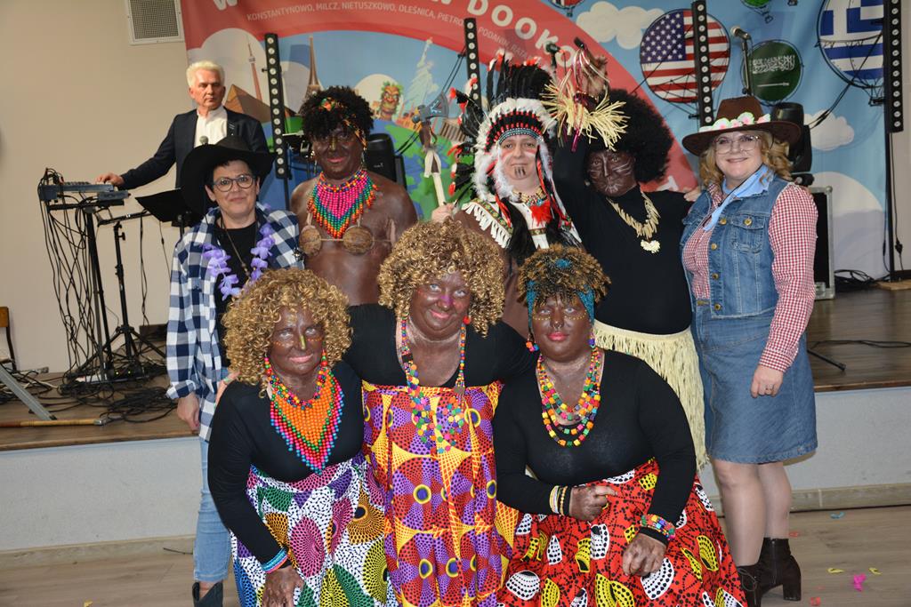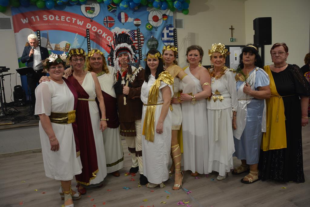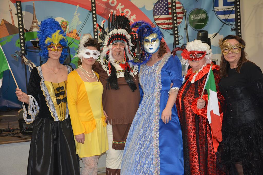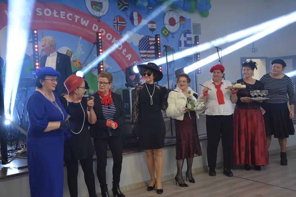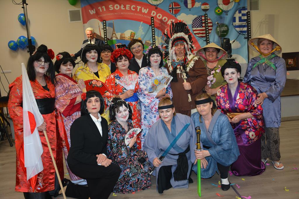 Świetnie przemyślane spotkanie to kolejny krok w kierunku integracji gminy. Tym razem władze gminy nawiązały do spotkania sprzed 3 lat pn. babski comber - głośnej wówczas poświęconej epoce średniowiecza imprezy, którą dosłownie na kilka dni przed ogłoszeniem pandemii udało się zorganizować. Teraz zamysł pomysłodawców był nieco inny, choć miał także równie edukacyjny charakter. 11 sołectw gminy uczestniczyło wcześniej w losowaniu, które decydowało jaki region lub kraj będą prezentowały. Efekty przeszły najśmielsze oczekiwania. W sali nie było nikogo(!), który by nie był ucharakteryzowany za mieszkańca, którejś z tych najbardziej malowniczych i popularnych destynacji. Zanim jednak zaczęły się prezentacje poszczególnych sołectw, do sali przygalopowała grupa kowbojek z jedną Indianką w efektownym pióropuszu, którą okazała się być wójt gminy i pomysłodawczyni imprezy Kamila Szejner.