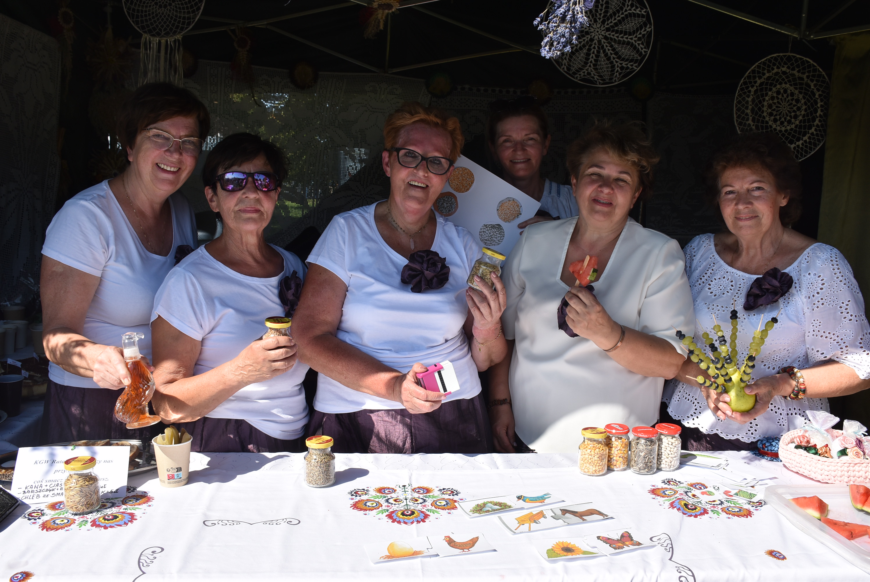 Nie inaczej działo się na stoisku Gminy Chodzież, które w tym roku reprezentowało sołectwo Rataje. To już tradycja iż zwycięzca w konkursie stoisk dożynkowych reprezentuje gminę na pikniku naukowym. W tym roku padło na Rataje, które wygrały konkurs „Stoisko dożynkowe 2023- Natura” i popisały się najładniejszym wieńcem w kategorii wieńców współczesnych. Na stoisku nie zabrakło więc potraw i lokalnych smakołyków autorstwa pań z KGW w Ratajach. Zgłodniali mogli liczyć m. in. na barszczyk z bułeczkami, chleb ze smalcem i ogórkiem czy różnorakie cista z herbatą lub kawą do kompletu. Dorośli by zdobyć upragnione pieczątki uczyli się rozpoznawać ziarna zbóż i układali puzzle. Najmłodsi zgadywali gdzie jest groch, czym się różni od kaszy i jak nazywają się poszczególne warzywa. Chętne dzieci po odpowiedzi na proste pytania dotyczących m.in. zwierząt hodowlanych obdarowywano kolorowankami. Ratajskie stoisko odwiedziły nie tylko panie z samorządu gminy Chodzież - zastępczyni wójta Ewa Kubiś i przewodnicząca rady gminy Ewa Śliwińska, ale także burmistrz Jacek Gursz, który chwalił jakość serwowanych przekąsek. Tuż obok po sąsiedzku swoje produkty - znakomitej jakości miody wystawiała pasieka Państwa Kermes. Tam też można było napić się smacznej (i zdrowej), lemoniady.