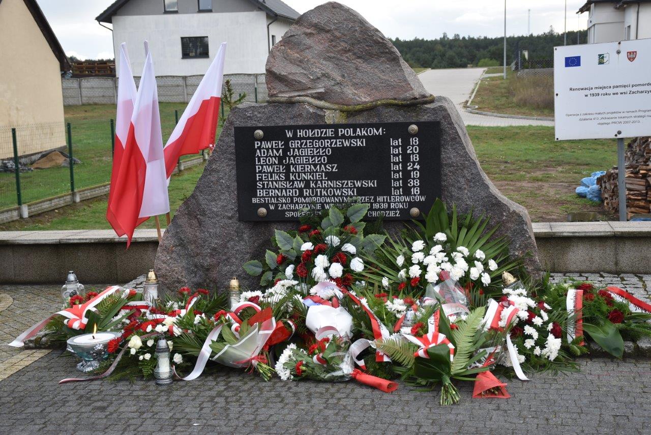 Kulminacyjnym punktem było zapalenie zniczy i złożenie wiązanek kwiatów na płycie pomnika. Tradycyjnie jako pierwsi uhonorowali śmierć swoich bliskich przedstawiciele rodzin pomordowanych. Chwilę później kwiaty złożyli samorządowcy i władze gminy, których reprezentowali m. in. wójt gminy Kamila Szejner, jej zastępczyni Ewa Kubiś, przewodnicząca rady gminy Ewa Śliwińska, a także radni. Nie zabrakło przedstawicieli starostwa z wicestarostą Mariuszem Witczukiem oraz miasta Chodzieży, z zastępcą burmistrza Piotrem Witkowskim. Licznie stawiły się delegacje stowarzyszeń (jak zawsze widoczny był SOCIUS), szkół, policji, OSP, jednostek podległych i samych mieszkańców Zacharzyna. Po zakończeniu uroczystości zebrani przemaszerowali do pobliskiego kościoła na uroczystą mszę św.