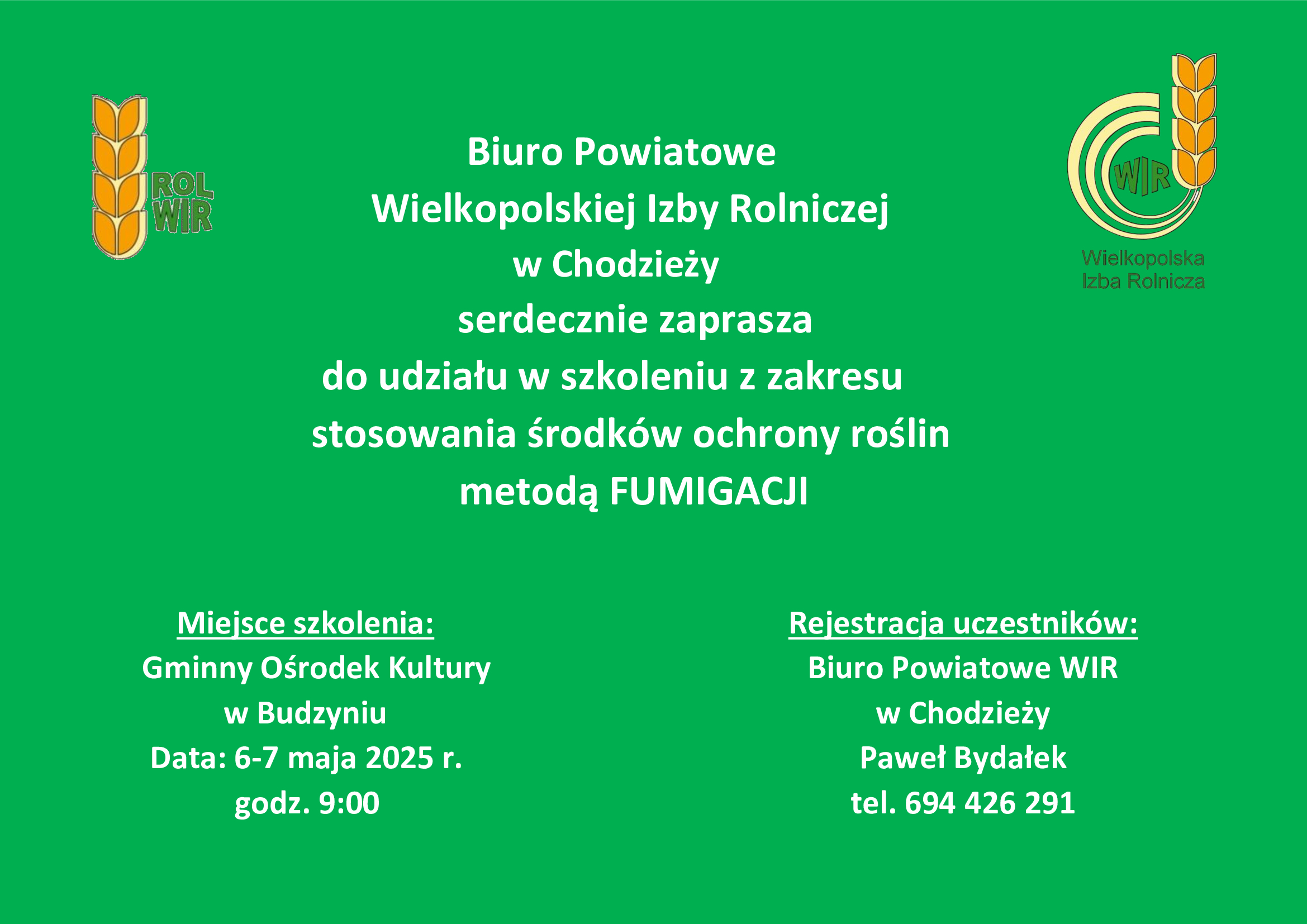 Szkolenie z zakresu stosowania środków ochrony roślin metodą fumigacji (gazowanie), odbędzie się 6 i 7 maja br. w GOK  Budzyń.