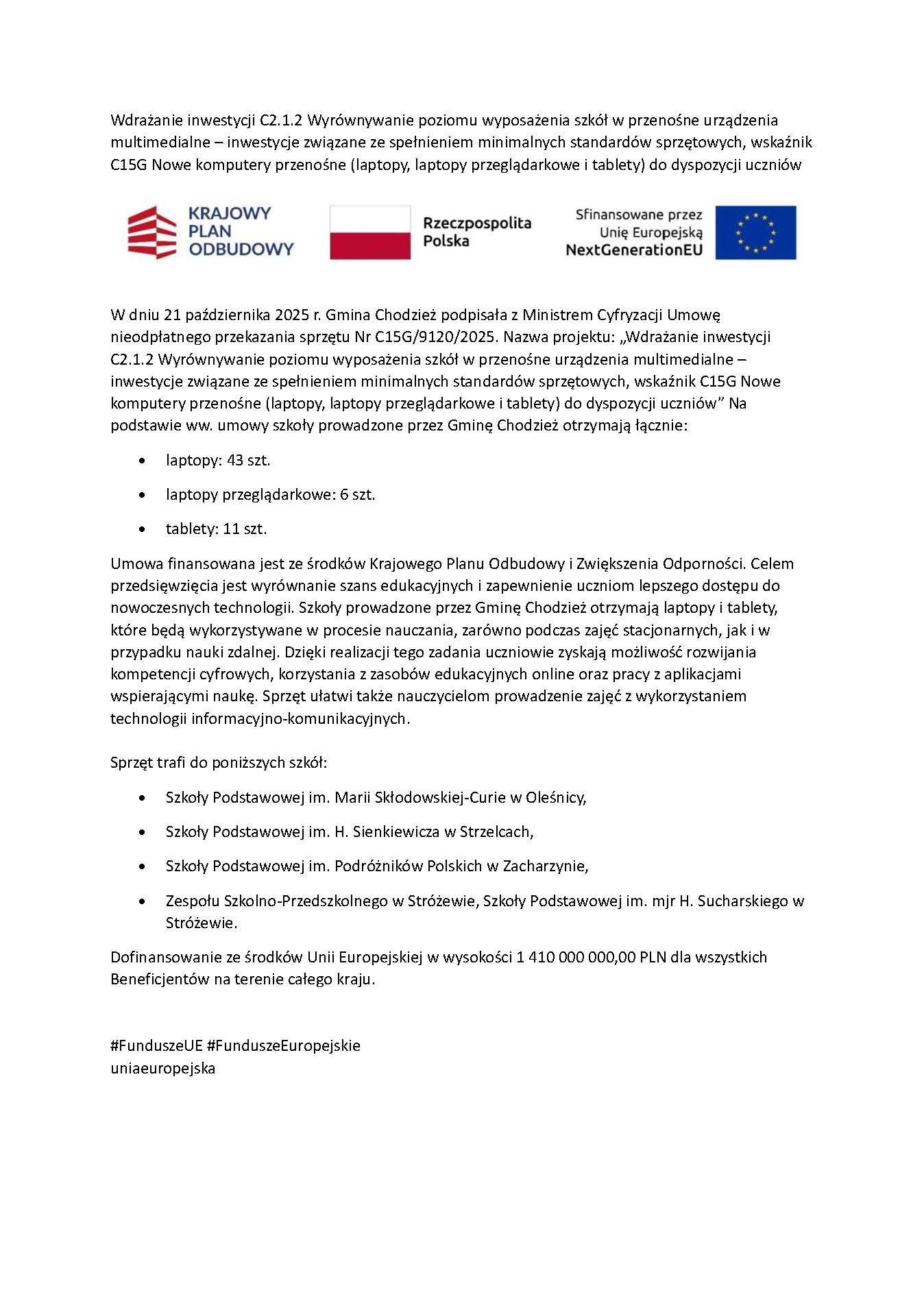 Wdrażanie inwestycji C2.1.2 Wyrównywanie poziomu wyposażenia szkół w przenośne urządzenia multimedialne