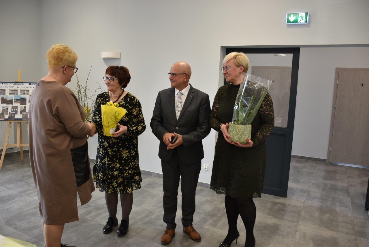 Podobne w treści życzenia złożyła przewodnicząca rady gminy Ewa Śliwińska, zaś w imieniu społeczności wioski radnym i władzom gminy podziękowały mieszkanki Zacharzyna - sołtys wsi Milena Różańska i radna gminy Anna Ślesińska-Nowak. Nowego obiektu pani wójt pogratulował także wicestarosta chodzieski Mariusz Witczuk z zadowoleniem informując, iż za kilka miesięcy po zakończeniu dodatkowych prac odbędą się tu dożynki. Punktem kulminacyjnym uroczystości było wspólne przecięcie wstęgi, a krótko potem nastąpiło poświęcenie wnętrza obiektu przez proboszcza parafii ks. Karola Łybka.