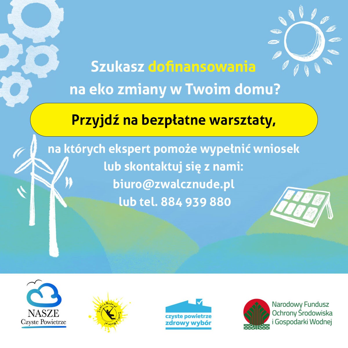 Jeżeli nie możesz przyjść na warsztaty skontaktuj się z ekspertem online: biuro@zwalcznude.pl, tel. 884 939 880 lub zadaj pytanie na grupie Czyste Powietrze – pomoc w pisaniu wniosków: