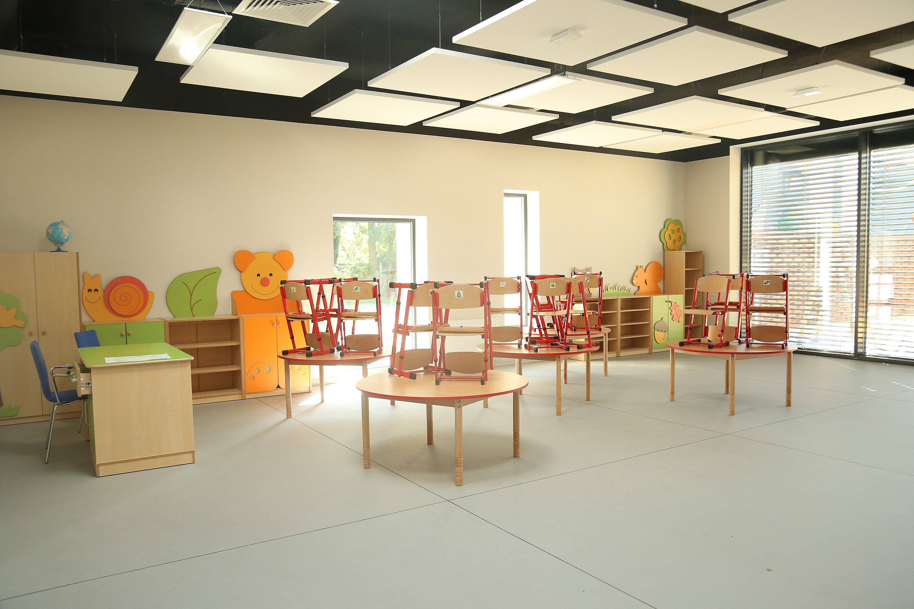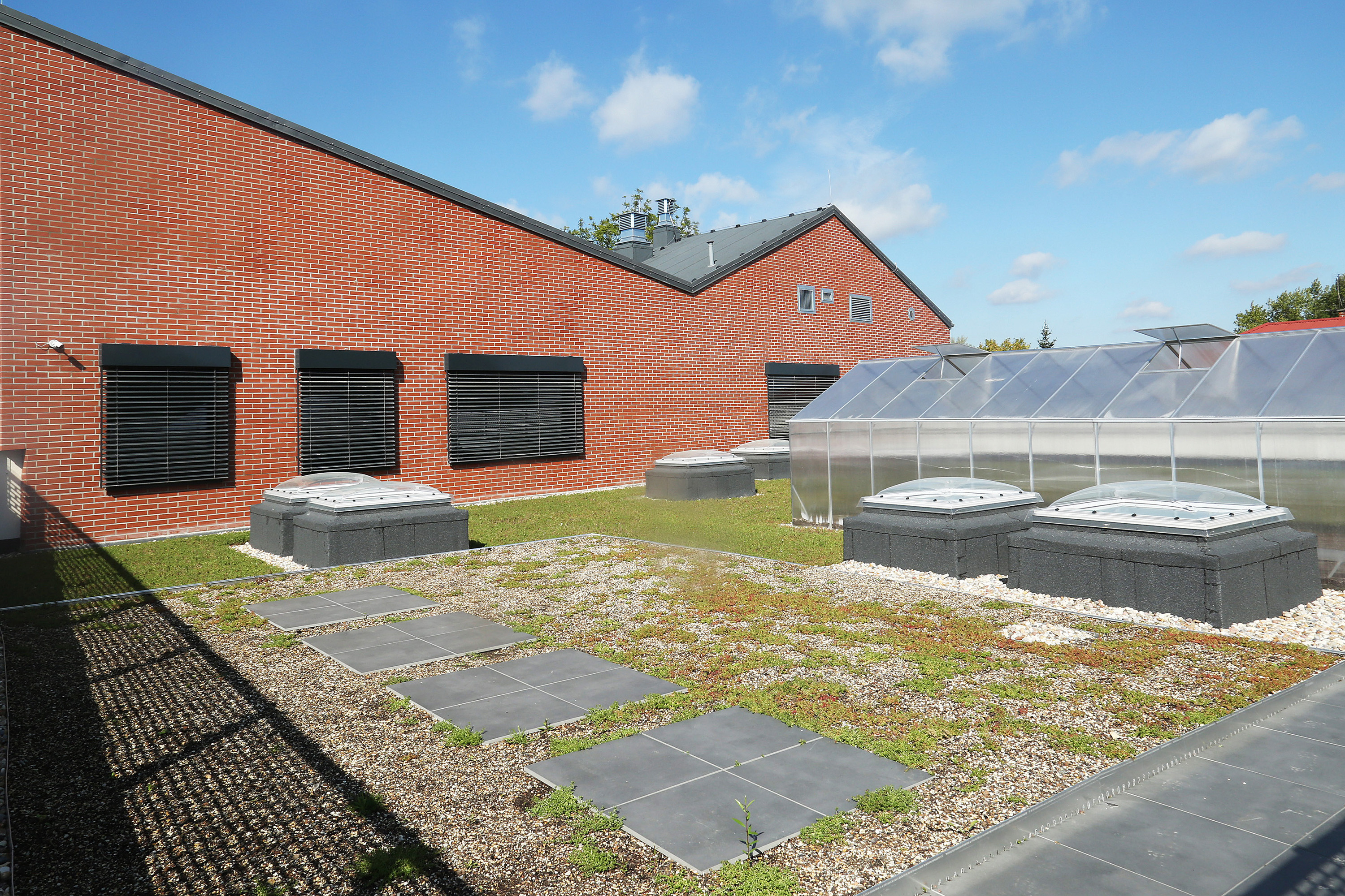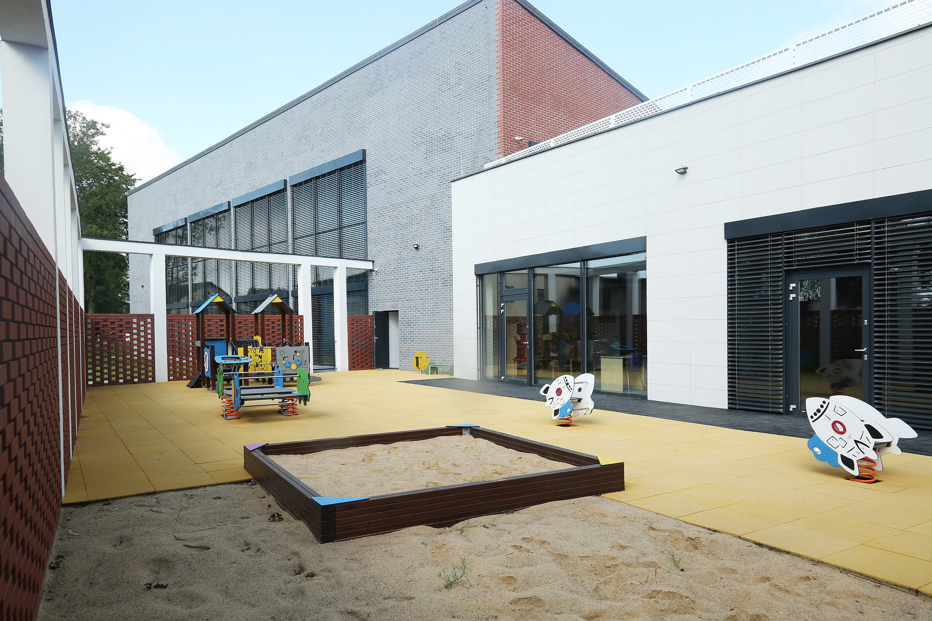 - drugą część budynku stanowi dwuoddziałowe, jednokondygnacyjne, przedszkole, na dachu którego wykonany został terenu edukacyjno-rekreacyjny z „zielonym dachem”.