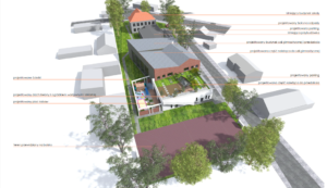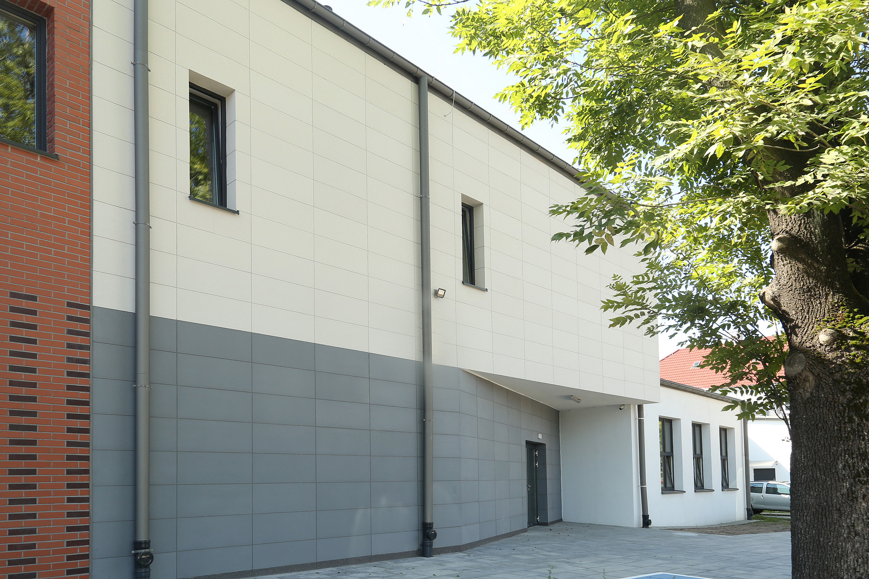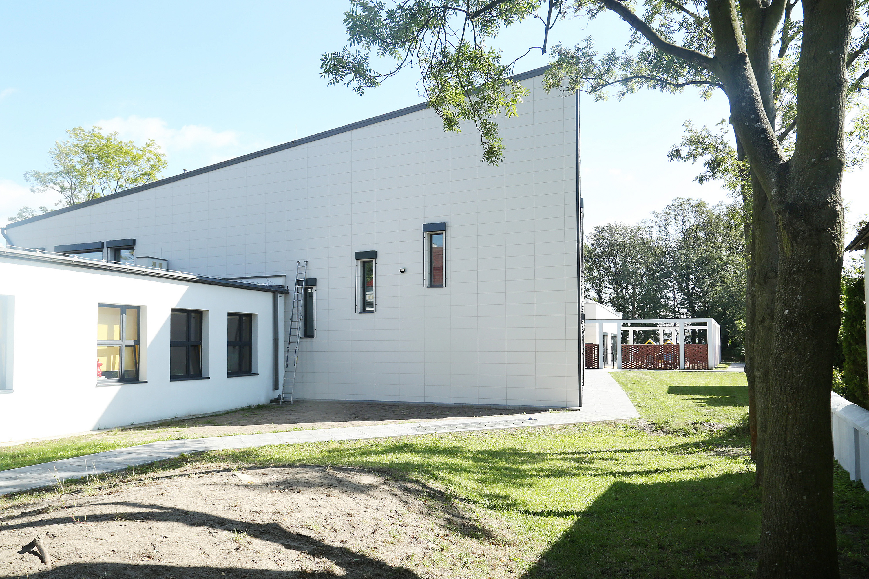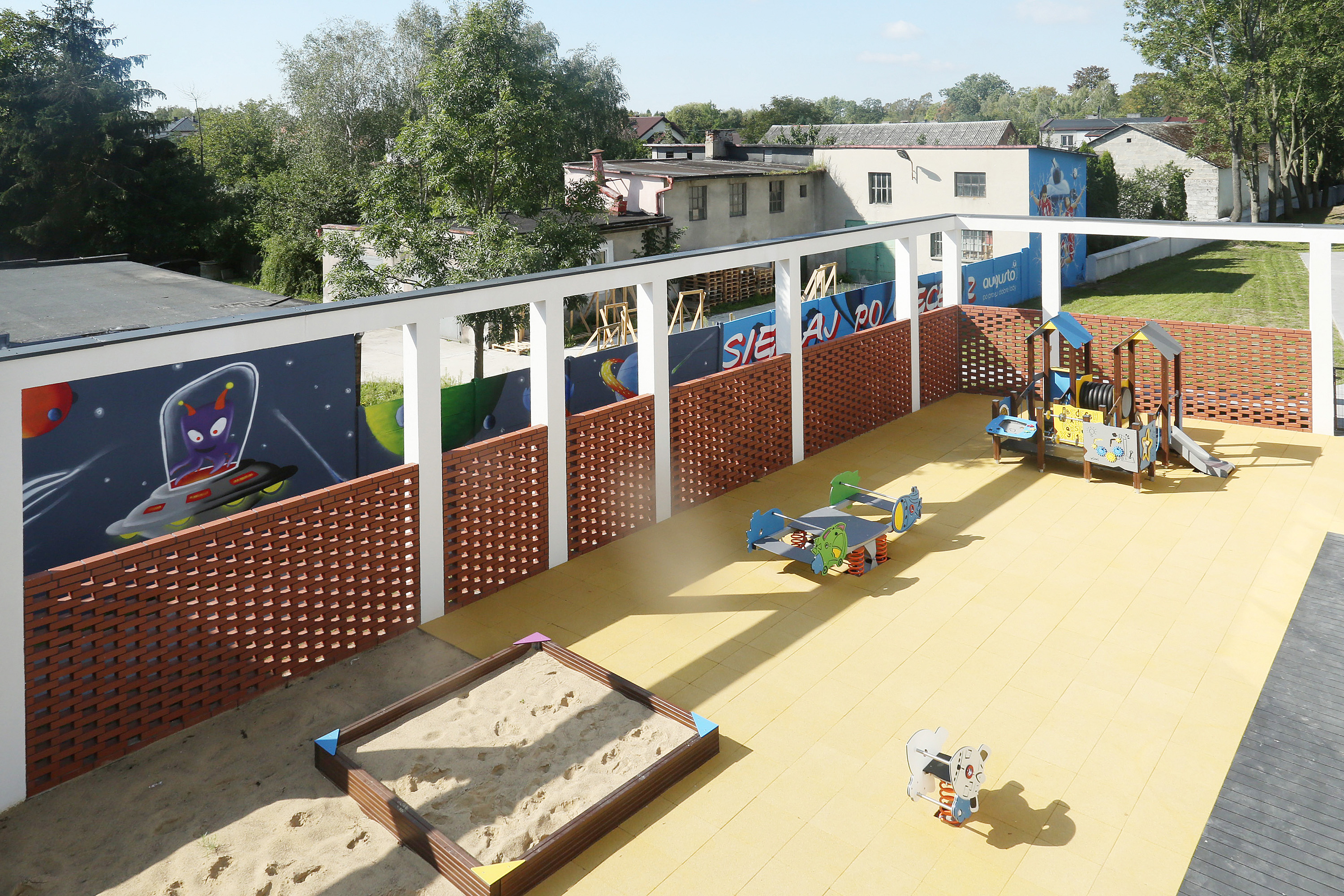 - drugą część budynku stanowi dwuoddziałowe, jednokondygnacyjne, przedszkole, na dachu którego wykonany został terenu edukacyjno-rekreacyjny z „zielonym dachem”.