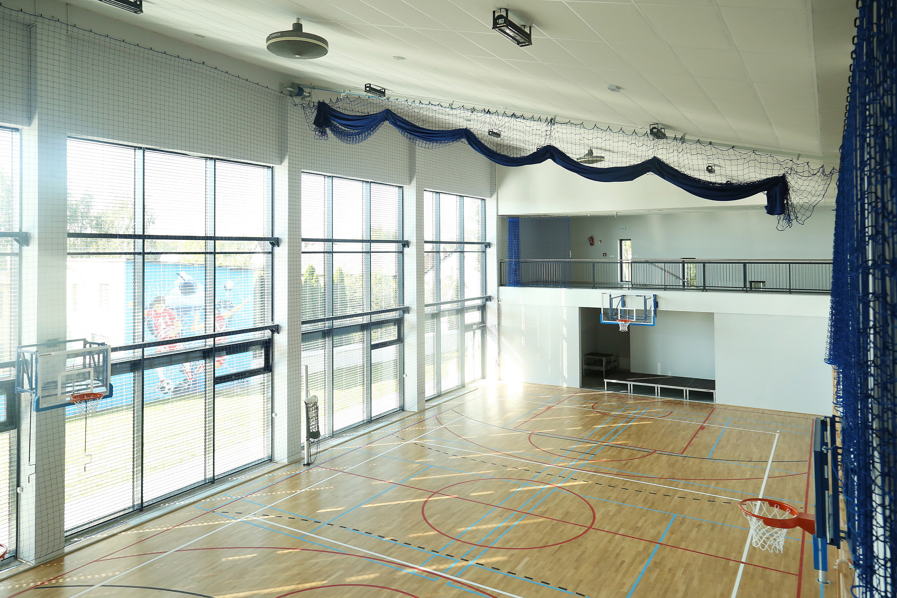 - pierwsza – sala gimnastyczna z zapleczem, stanowiąca budynek trzykondygnacyjny, czyli dwupiętrowy z poddaszem użytkowym, na parterze którego znajduje się m.in. sala gimnastyczna z wielofunkcyjnym boiskiem, wejście główne, hall oraz szatnie, toalety, pokój trenera, magazyn sprzętu. Pierwsze piętro zajmują 4 sale przeznaczone do zajęć i ćwiczeń sportowych wraz z zapleczami, toalety. Drugie piętro (poddasze użytkowe) stanowi zaplecze techniczne w całości przeznaczone na kotłownię i wentylatornię,