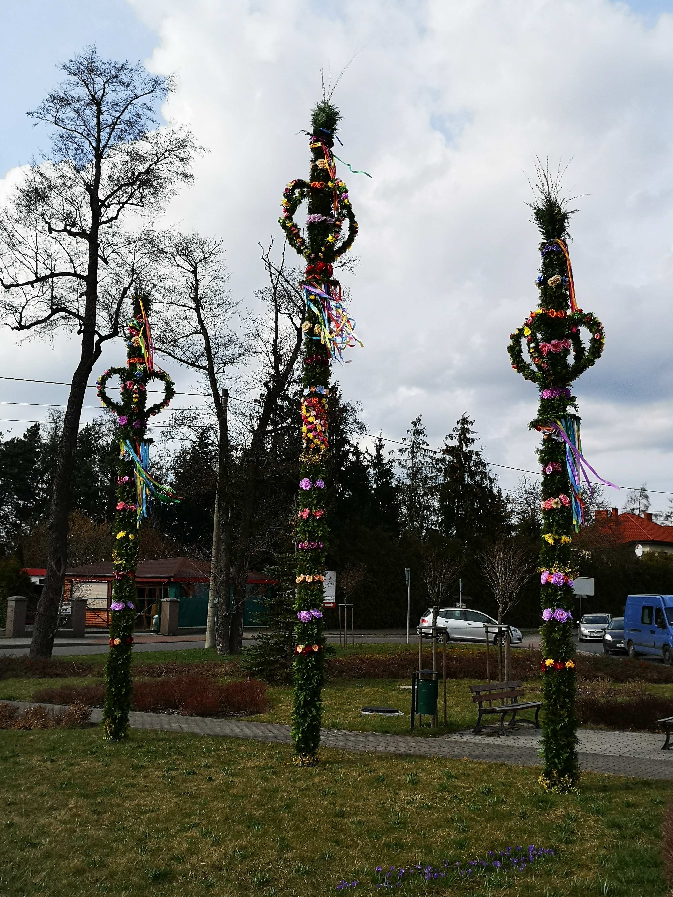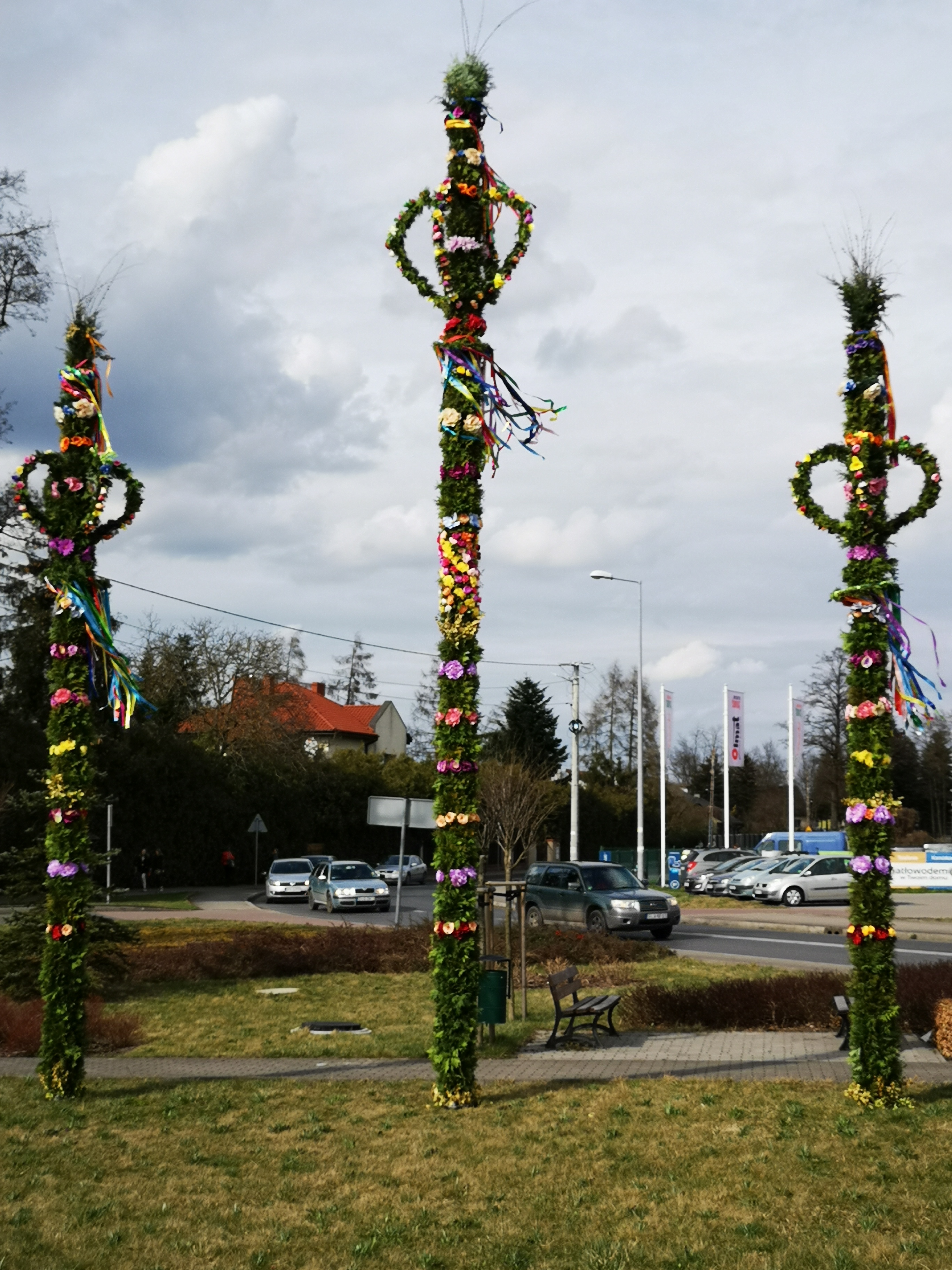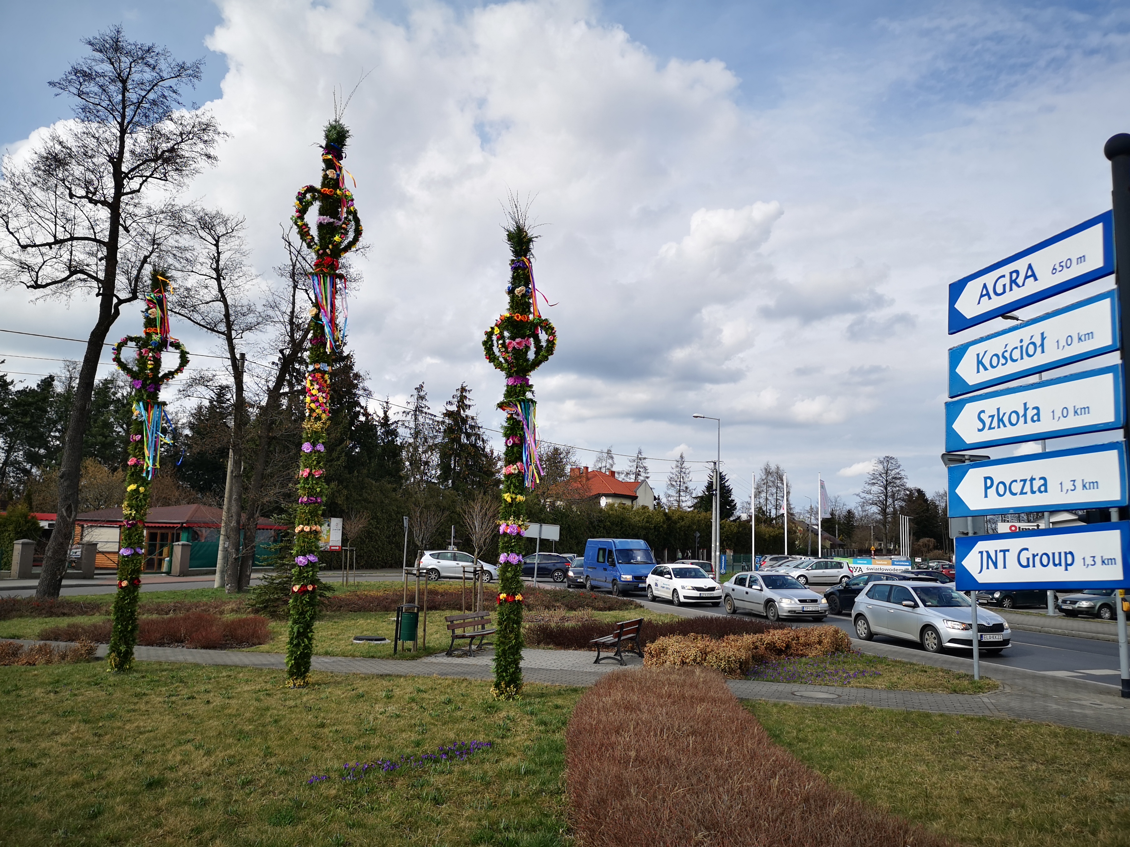 Na skwerze przy ulicy Sienkiewicza i Wrocławskiej w Dobroniu znów można podziwiać trzy imponujące rozmiarem palmy wielkanocne. Niezwykłe dzieło Pań z Koła Gospodyń Wiejskich w Mogilnie Małym przypomina o nadchodzących świętach. Na kilka dni przed Niedzielą Palmową dobroński skwer, jak co roku ozdobiły wielkanocne palmy, do których wykonania użyto zarówno naturalnych materiałów: tui, bukszpanu, bazi wierzby, jak i też sztucznych kwiatów. Zamysłem twórczyń było, aby te niezwykłe dzieła, jak najdłużej cieszyły oko mieszkańców oraz przejeżdżających przez Dobroń gości. Dobrońskich palm nie sposób nie zauważyć. Najwyższa z nich ma aż siedem metrów wysokości, a dwie mniejsze są niższe tylko o metr! Ozdoby robią wrażenie i imponują rozmiarem. Ich wykonanie kosztowało sporo pracy, ale było warto, bowiem te unikatowe świąteczne ozdoby zwracają uwagę przechodniów i zmotoryzowanych przejeżdżających przez Dobroń. Efektu dopełniają krokusy - fioletowe zwiastuny wiosny, które wciąż jeszcze można spotkać na trawnikach przy wielkanocnych palmach.