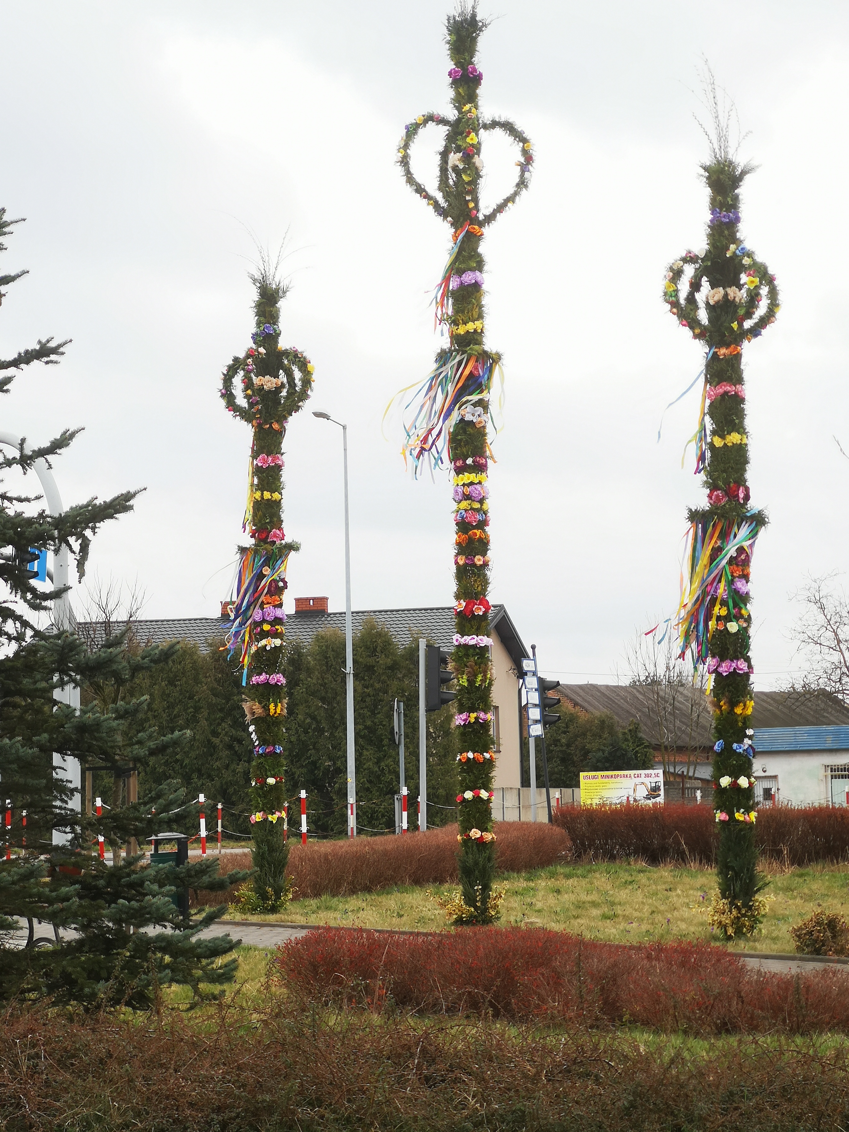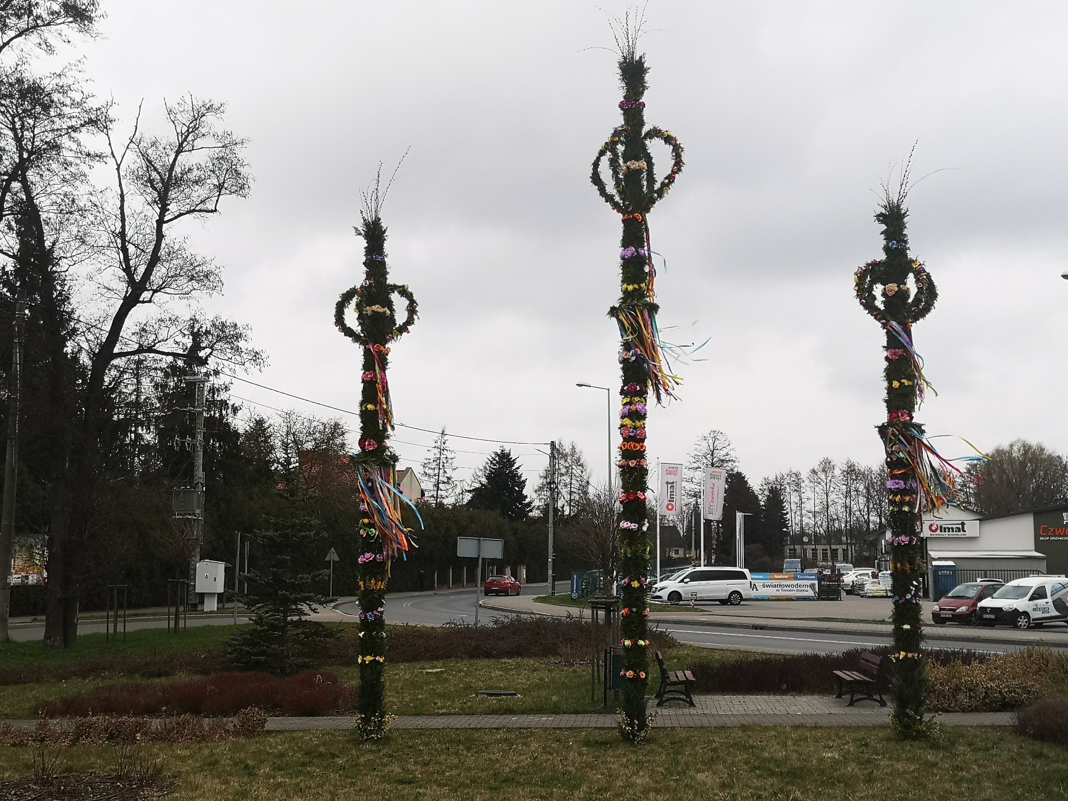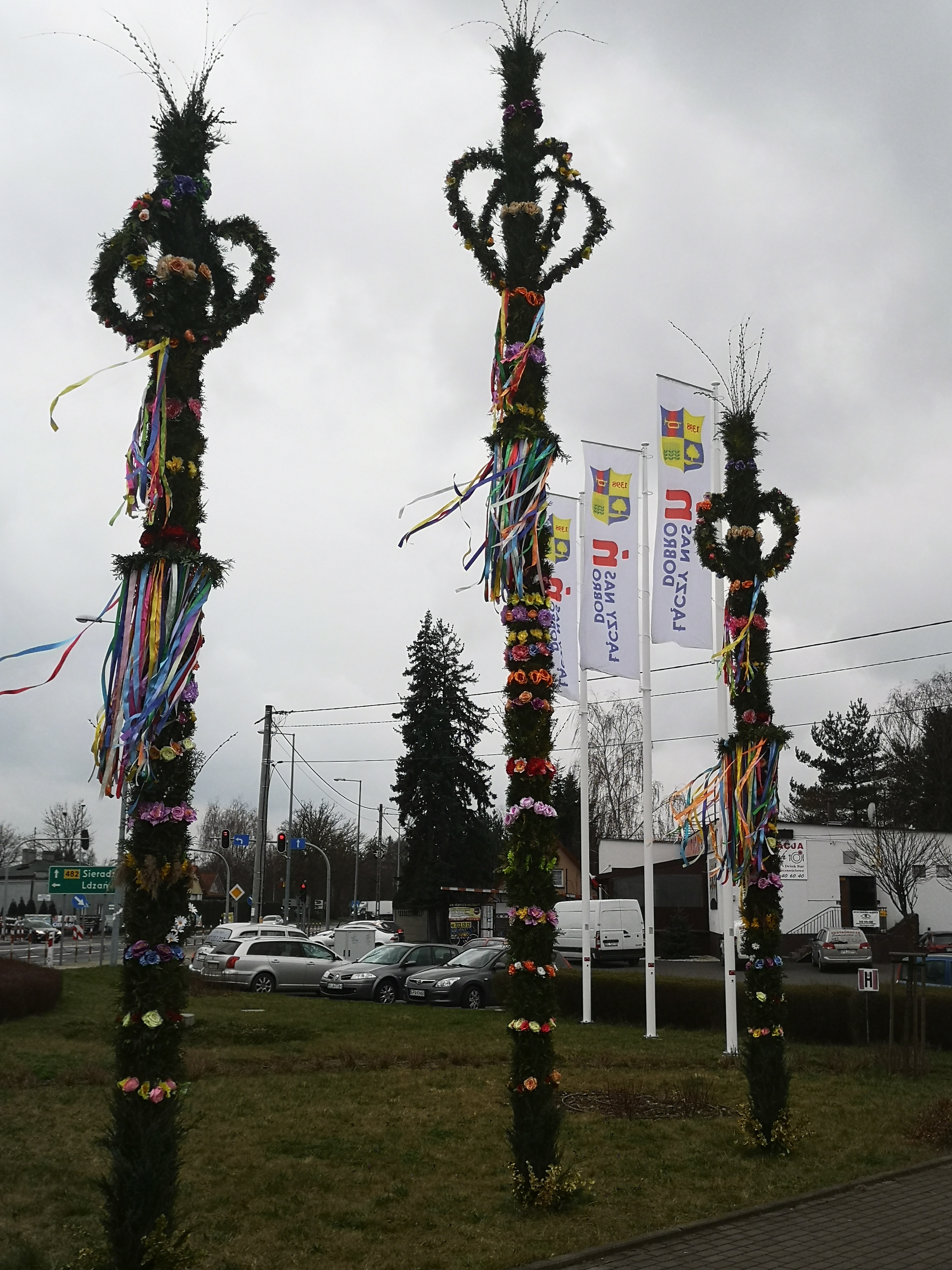 Dobrońskich palm nie sposób nie zauważyć. Najwyższa z nich ma aż siedem metrów wysokości, a dwie pozostałe są niewiele niższe. Ozdoby robią wrażenie i imponują rozmiarem. Ich wykonanie kosztowało sporo pracy, ale było warto, bowiem te unikatowe świąteczne ozdoby zwracają uwagę przechodniów i zmotoryzowanych przejeżdżających przez Dobroń. Wprawne oko dostrzeże jeszcze ostatnie z kwitnących krokusów. Te fioletowe zwiastuny wiosny, wciąż jeszcze można spotkać na trawnikach przy wielkanocnych palmach.