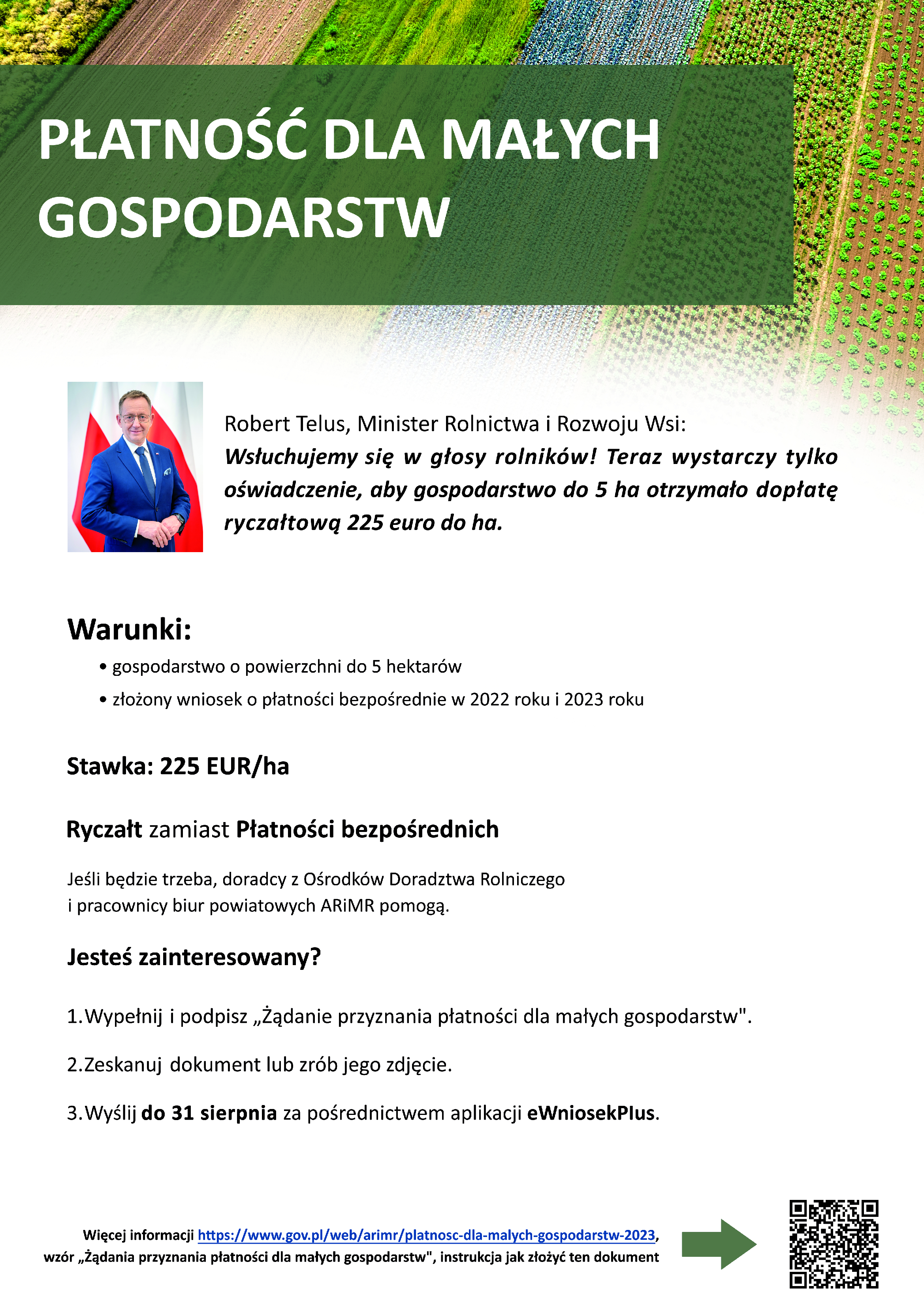 Więcej informacji dostępnych jest na stronie internetowej ARiMR https://www.gov.pl/web/arimr/platnosc-dla-malych-gospodarstw--2023