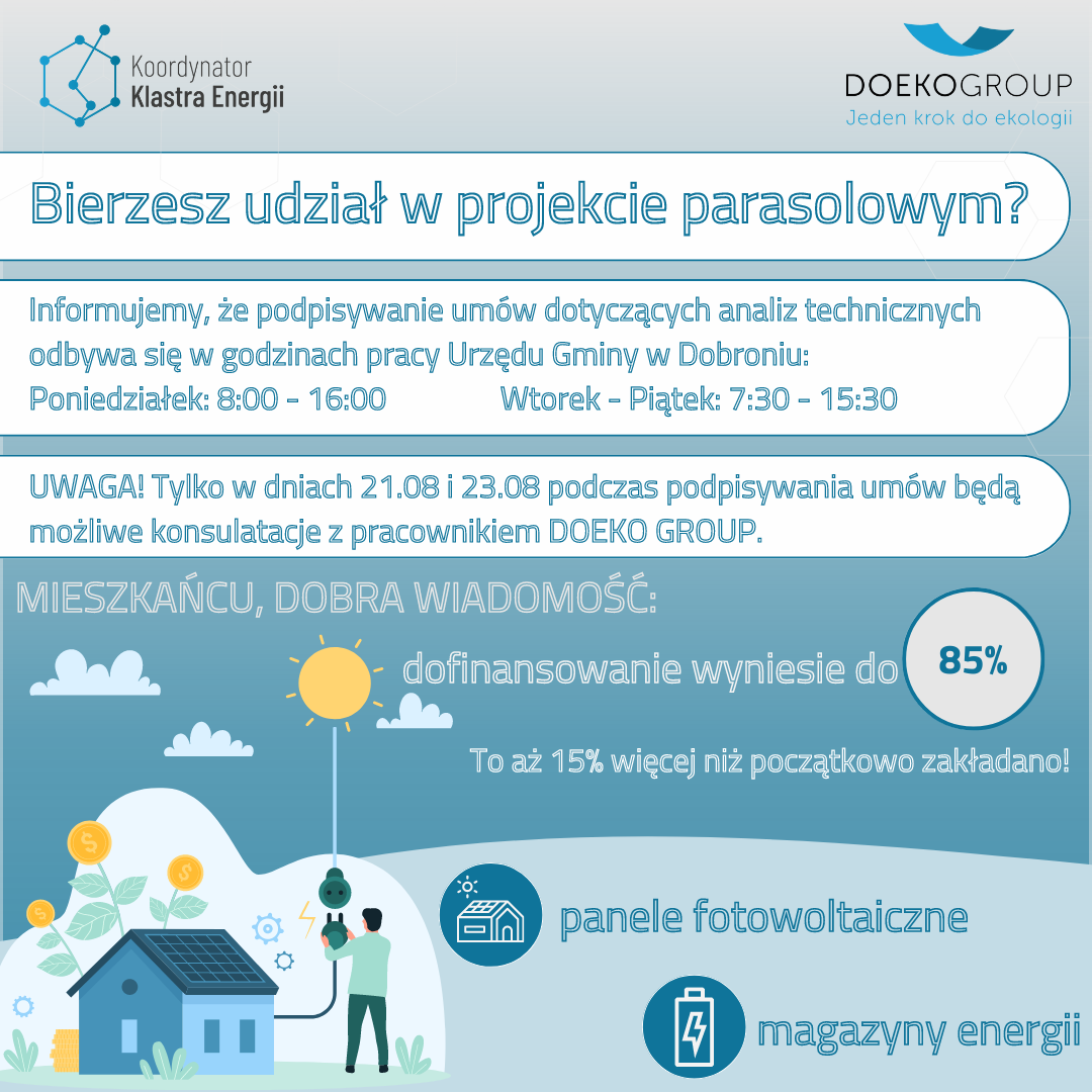 Umowy, dotyczące analiz technicznych podpisywane będą z mieszkańcami w dniach 21.08.2023 r. (godz. 8.00-16.00) i 23.08.2023 r. (godz. 7.30-15.30) w obecności pracownika Firmy DOEKO GROUP. Osoby, które we wskazanym terminie nie będą mogły podpisać stosownej umowy proszę o stawienie się w Urzędzie Gminy w Dobroniu w terminie do dnia 25.08.2023 r. celem dopełnienia stosownych formalności. Na potrzeby zawarcia umowy prosimy zabrać ze sobą dokument potwierdzający prawo własności nieruchomości.