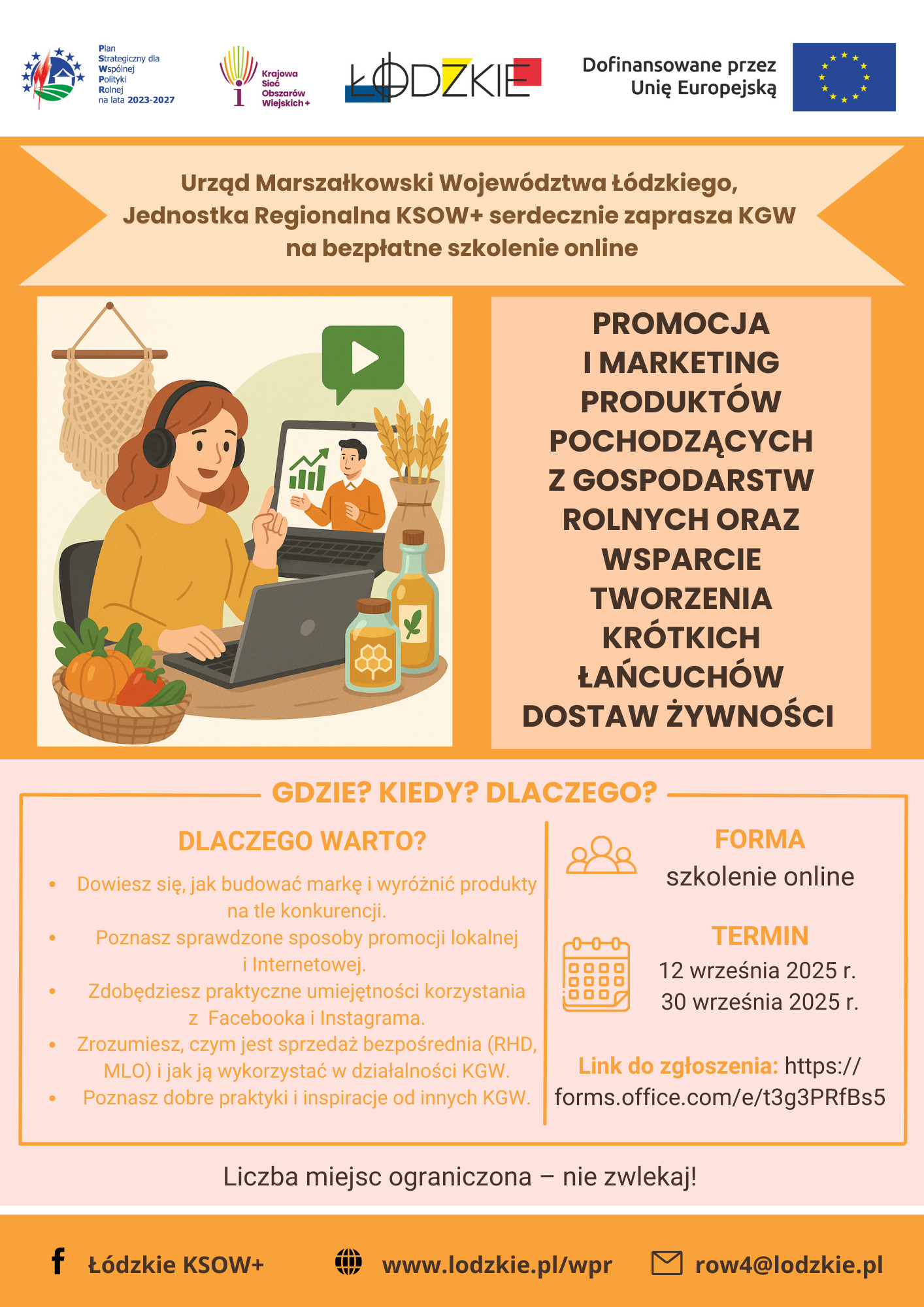Urząd Marszałkowski Województwa Łódzkiego, Jednostka Regionalna KSOW+, organizuje bezpłatne szkolenie online dla Kół Gospodyń Wiejskich z terenu naszego województwa.