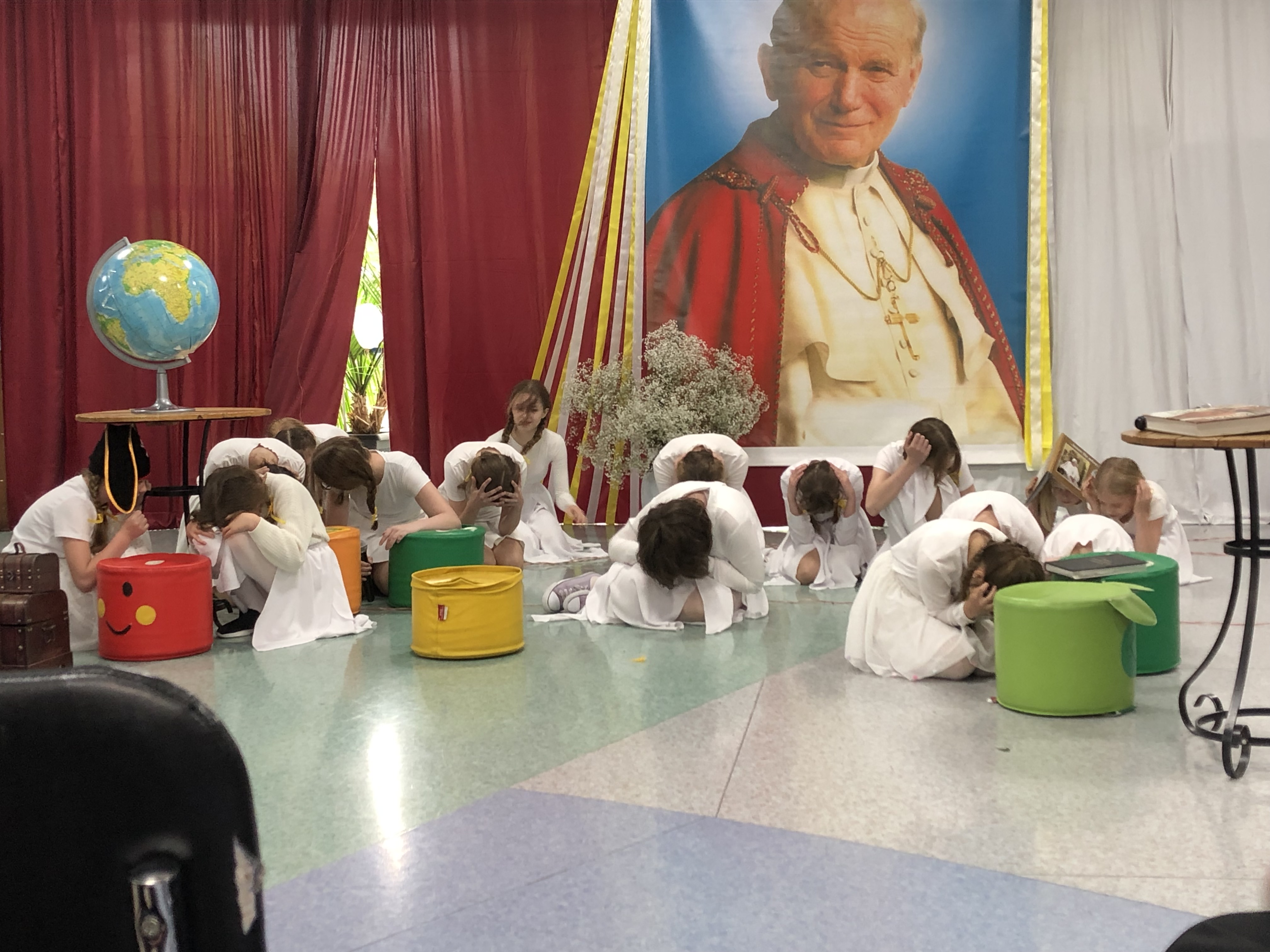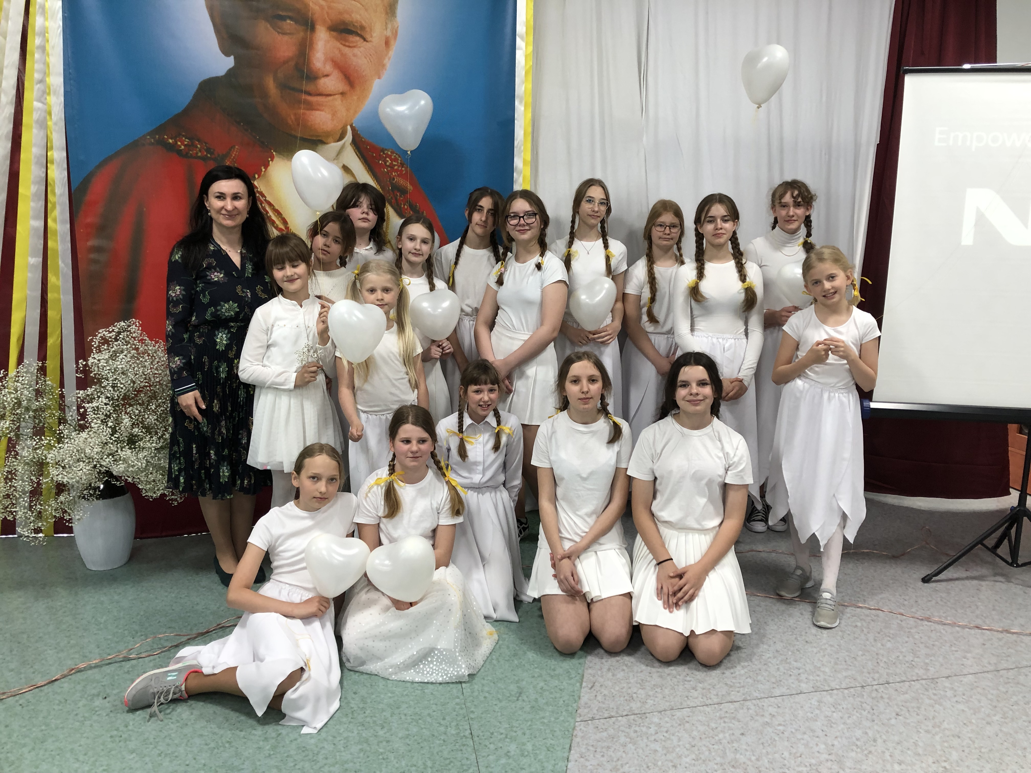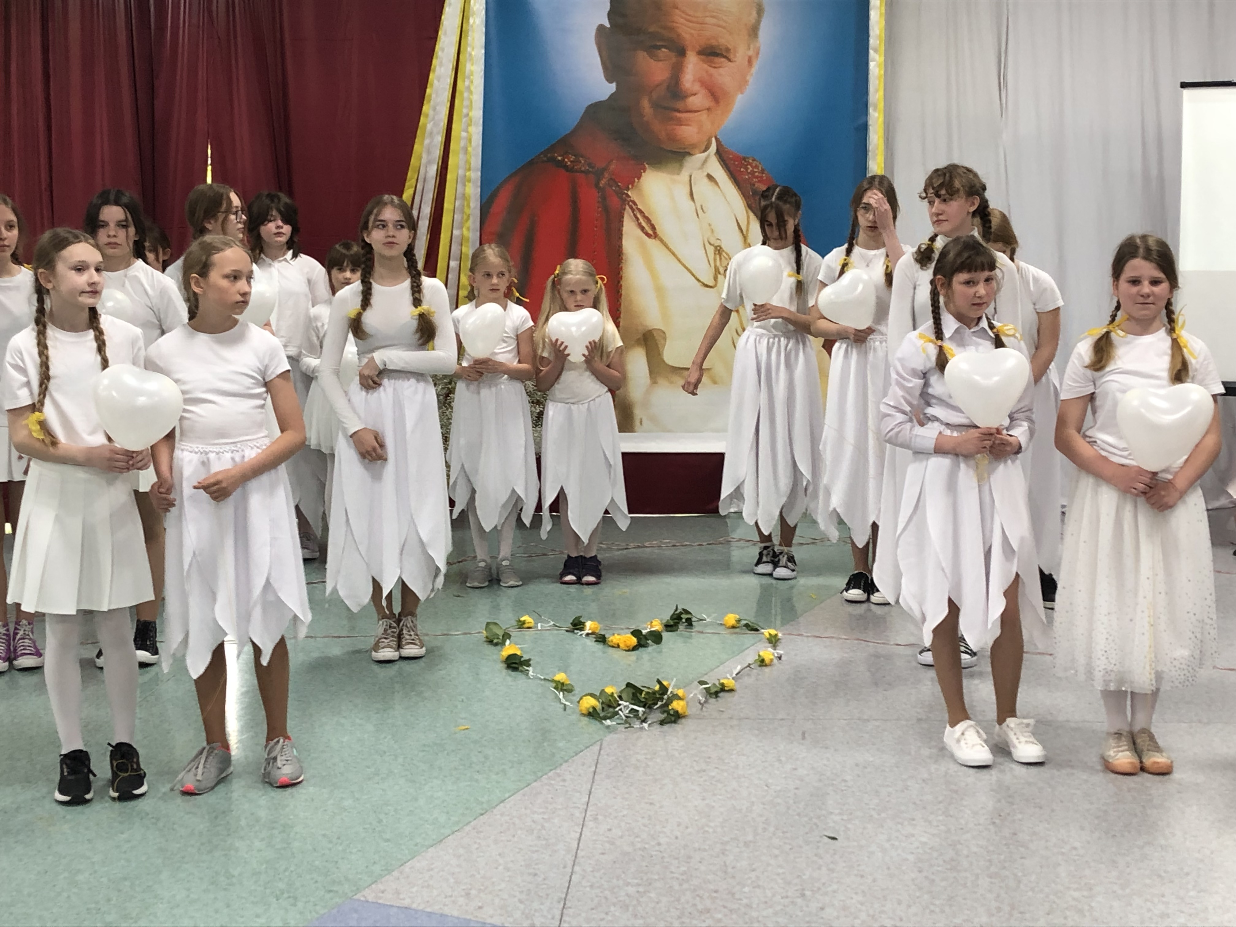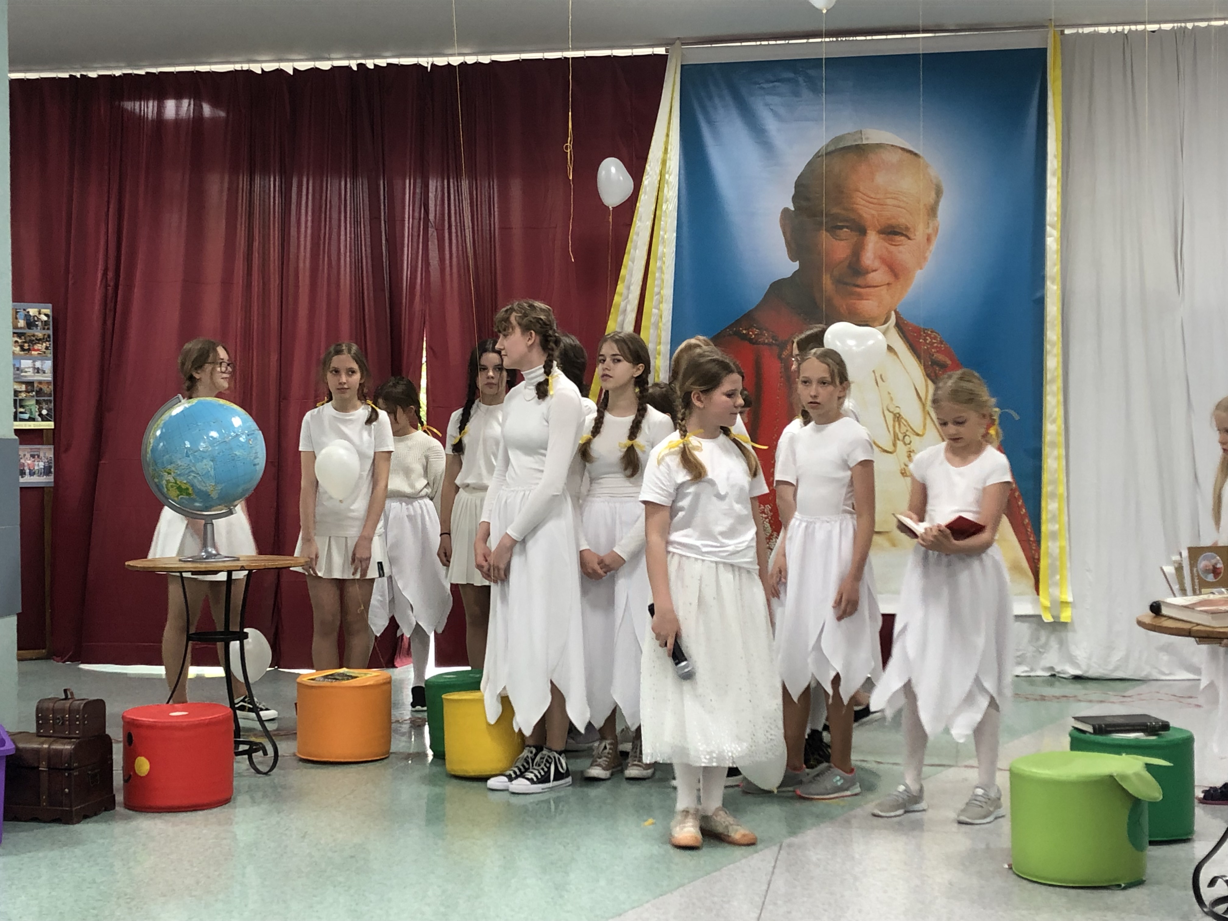w Łodzi, ks. K. Glinianego-Proboszcza Parafii św. Wojciecha w Dobroniu, starszego aspiranta P. Draba-dzielnicowego, starszego aspiranta T. Lewandowskiego-dzielnicowego, p. M. Brachę- Przewodniczącą Rady Rodziców, na chwilę zadumy, refleksji i wspomnień o Karolu Wojtyle- Janie Pawle II. By uczcić Papieża, sterownika „ Łodzi Piotrowej przez 27 lat”, trzeba dobrać słowa, by prawdziwa była zawsze słów wymowa. O jego wielkości i pracy codziennej- etiuda „ Nasz skarb”, 19 maja 2023 roku opowieść snuła…
