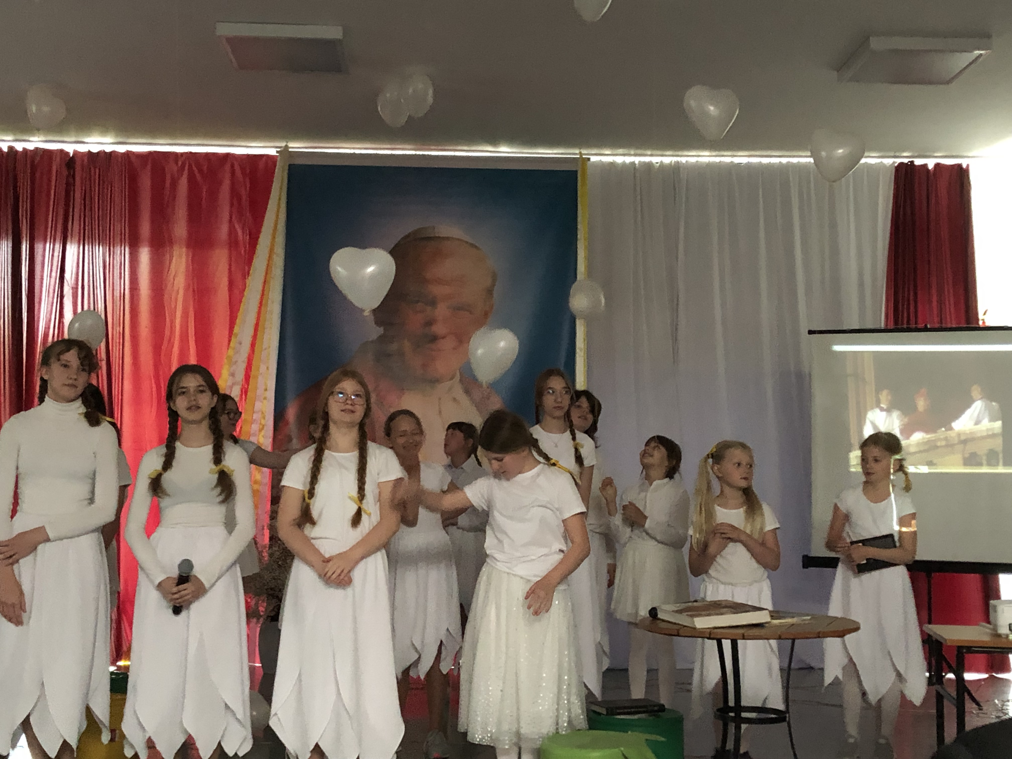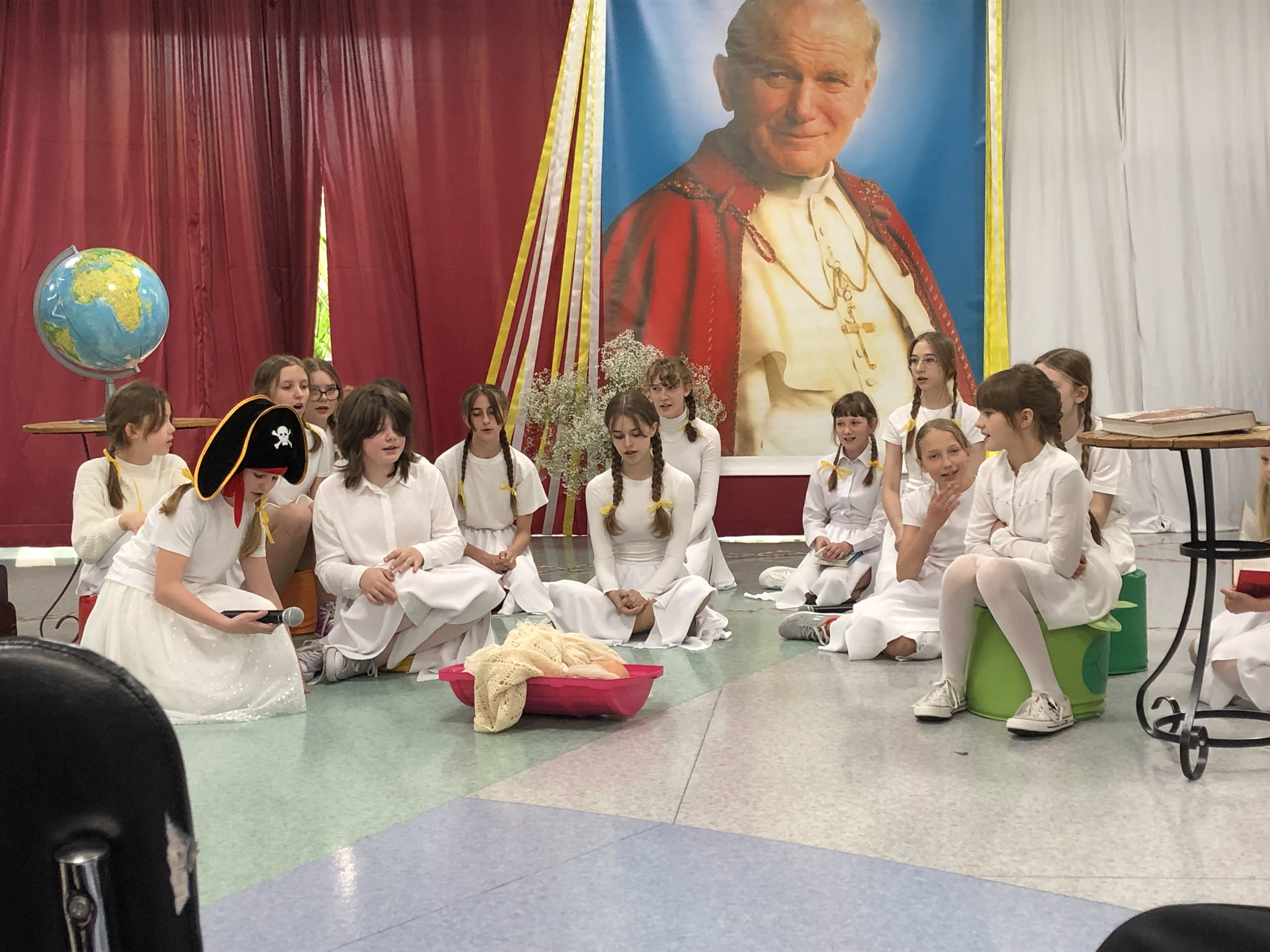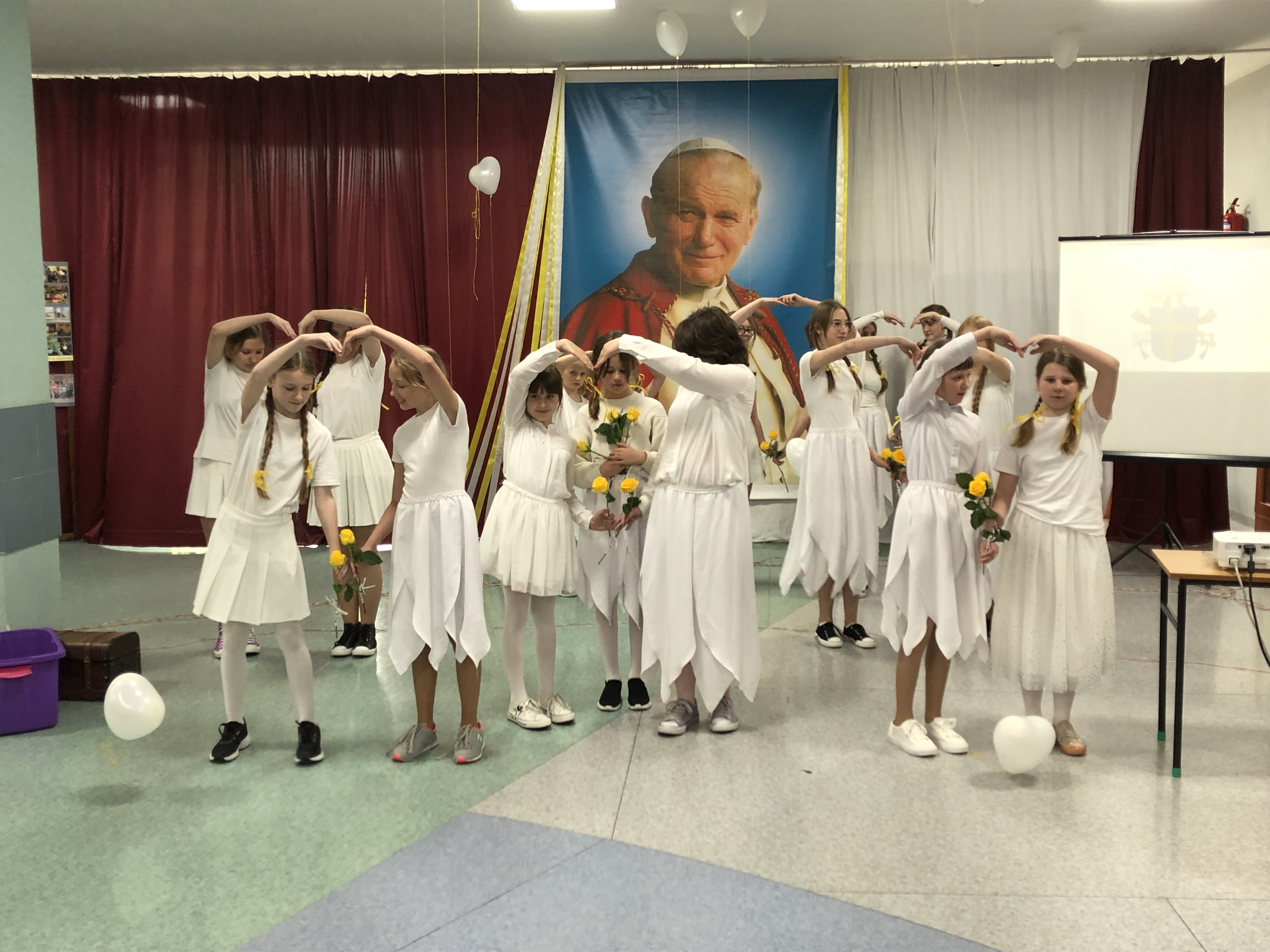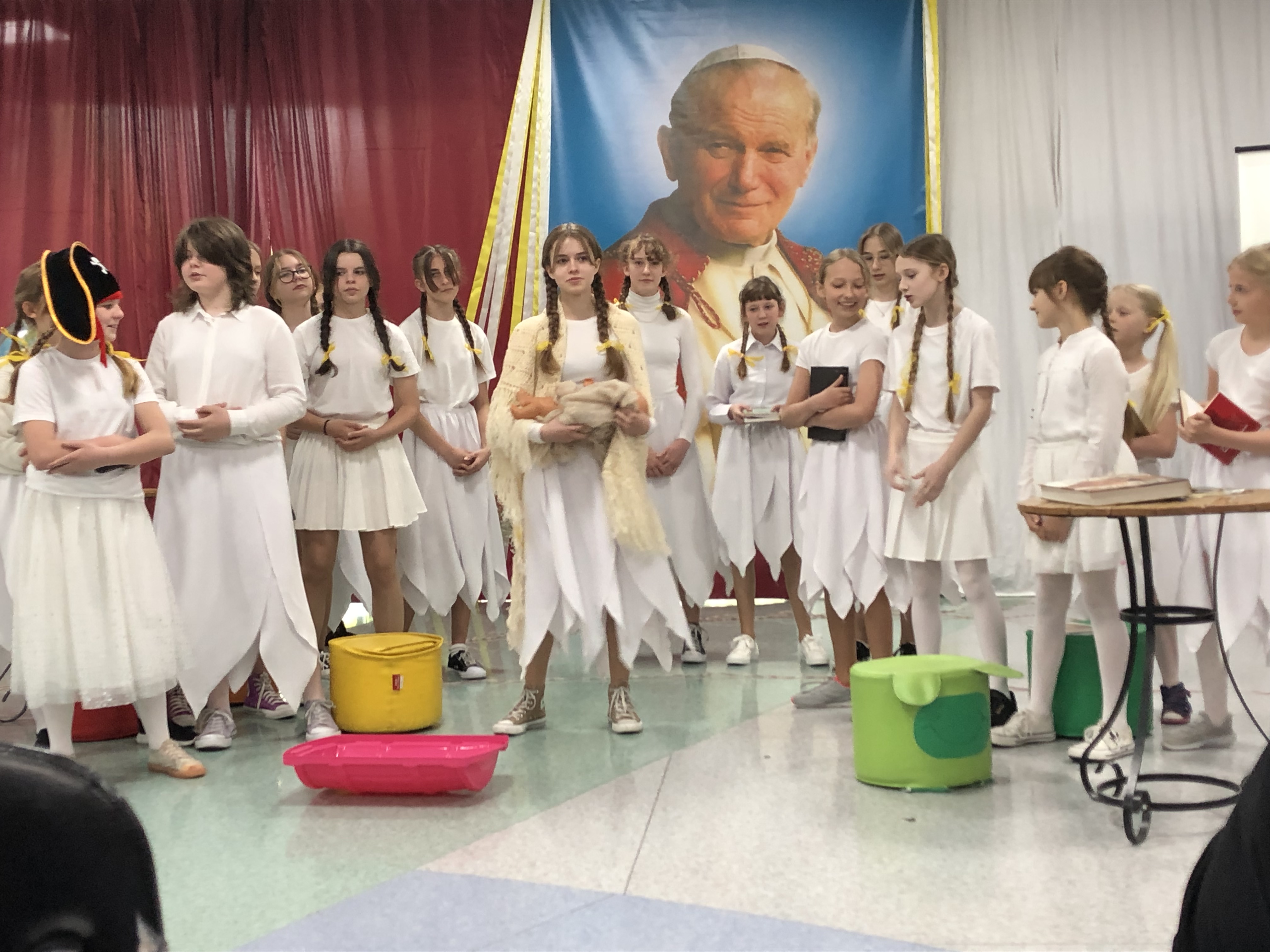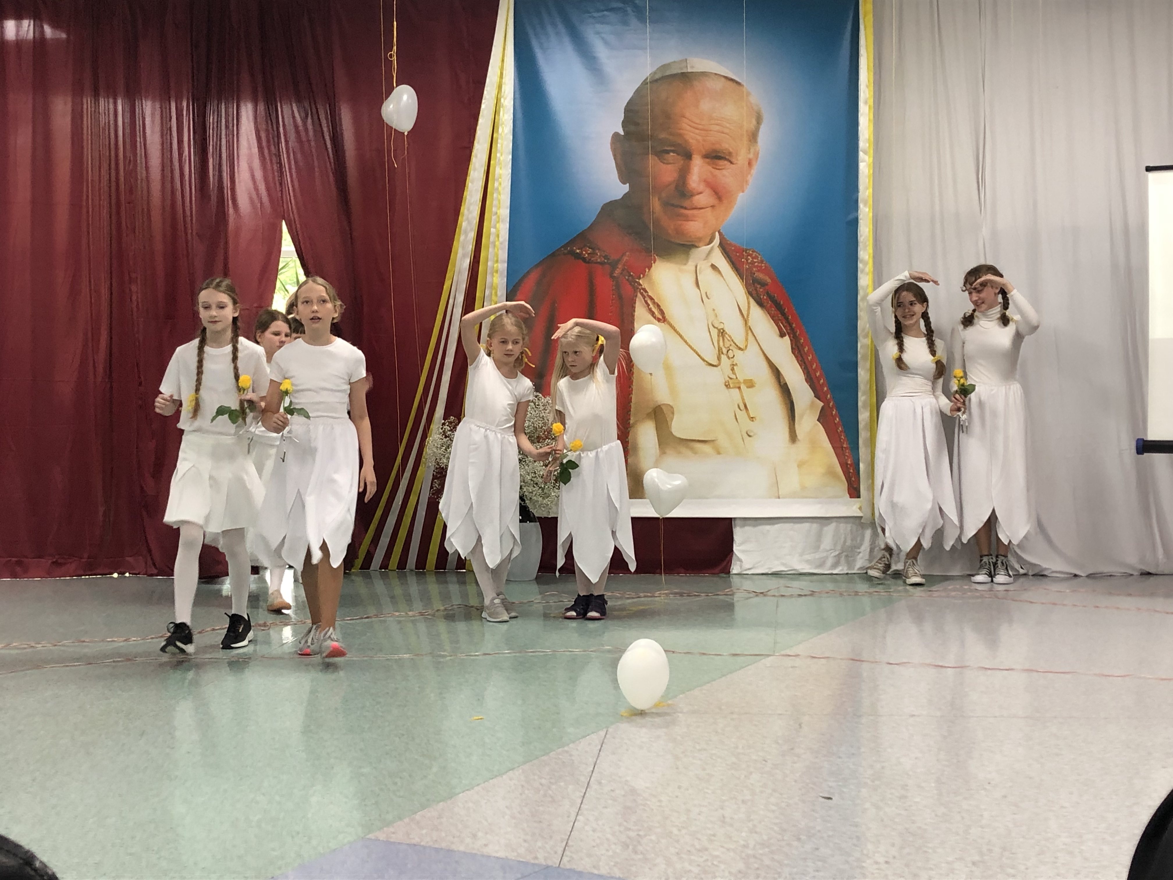 w Łodzi, ks. K. Glinianego-Proboszcza Parafii św. Wojciecha w Dobroniu, starszego aspiranta P. Draba-dzielnicowego, starszego aspiranta T. Lewandowskiego-dzielnicowego, p. M. Brachę- Przewodniczącą Rady Rodziców, na chwilę zadumy, refleksji i wspomnień o Karolu Wojtyle- Janie Pawle II. By uczcić Papieża, sterownika „ Łodzi Piotrowej przez 27 lat”, trzeba dobrać słowa, by prawdziwa była zawsze słów wymowa. O jego wielkości i pracy codziennej- etiuda „ Nasz skarb”, 19 maja 2023 roku opowieść snuła…