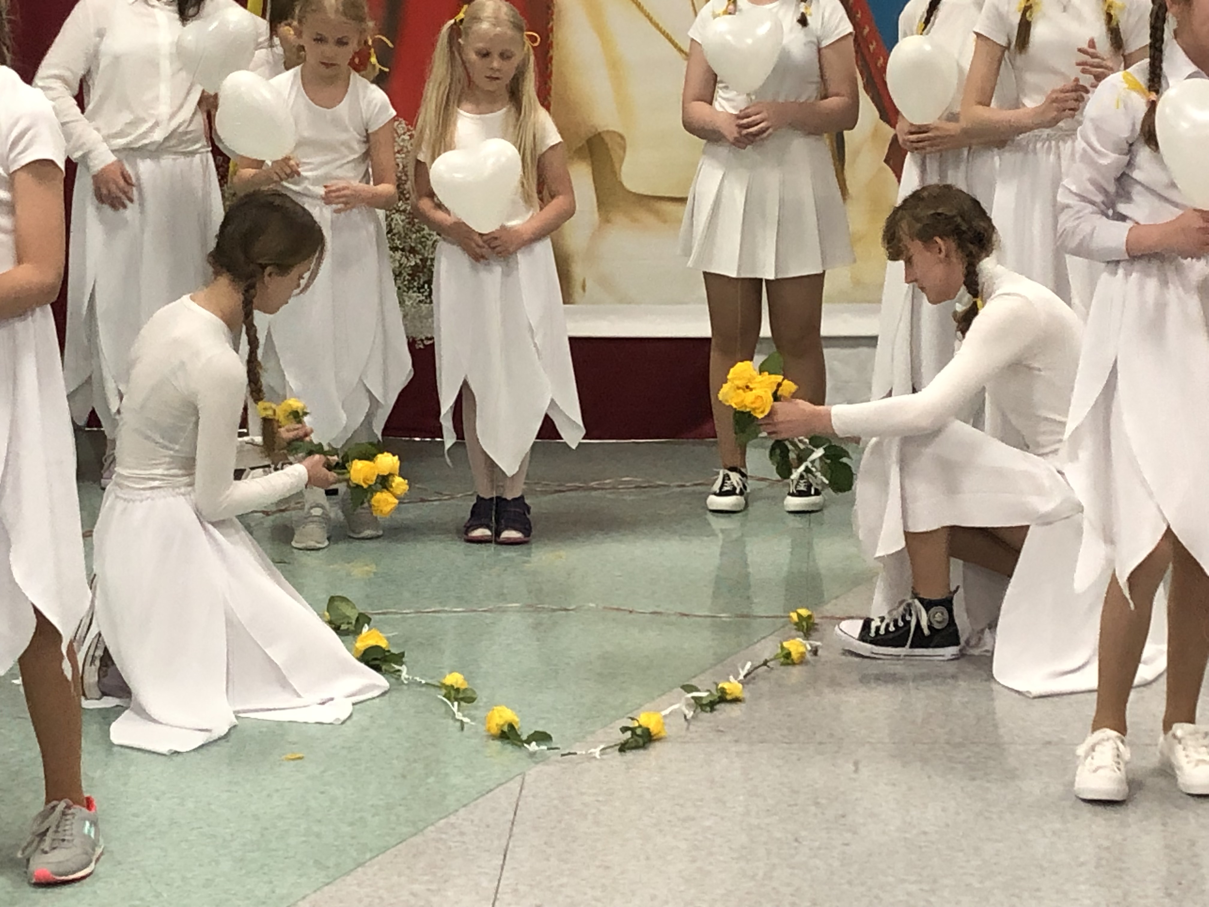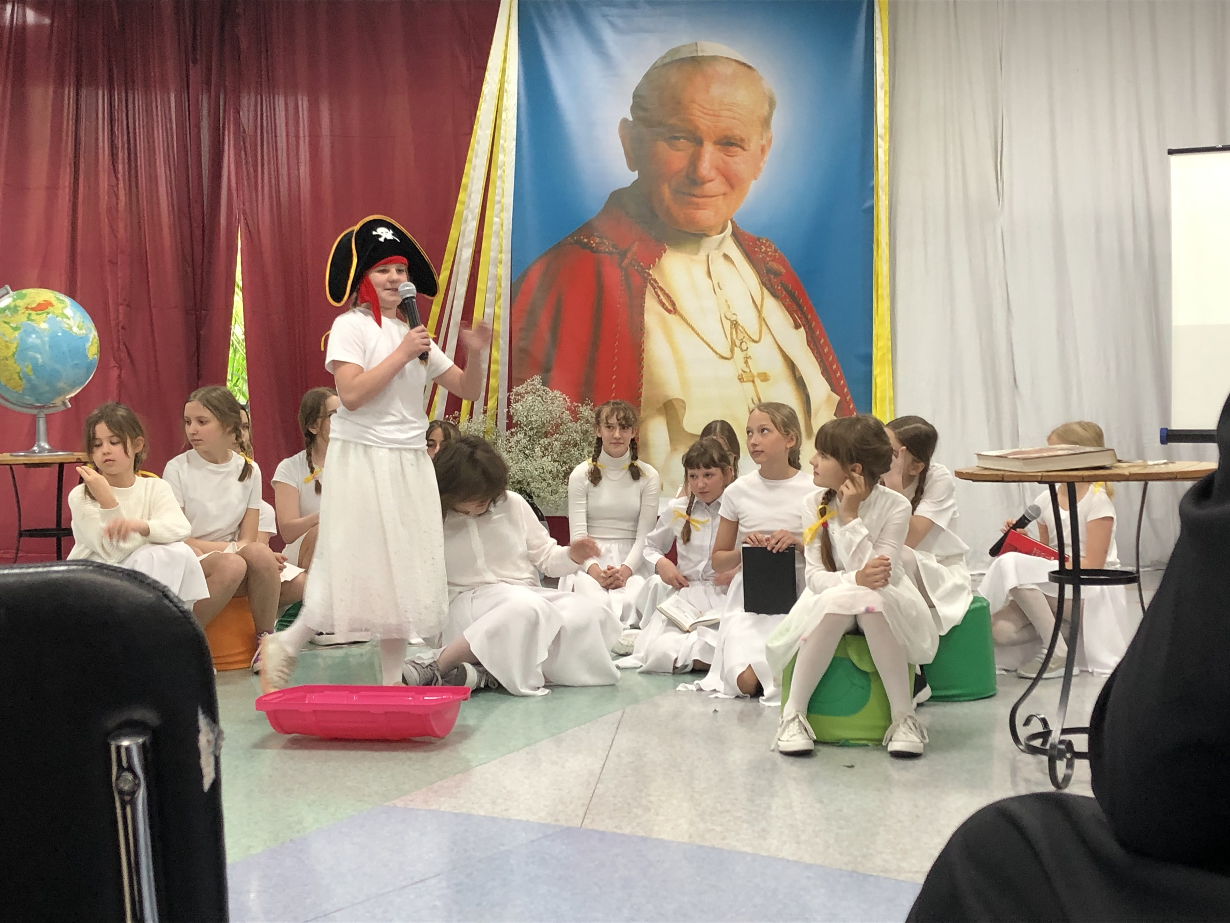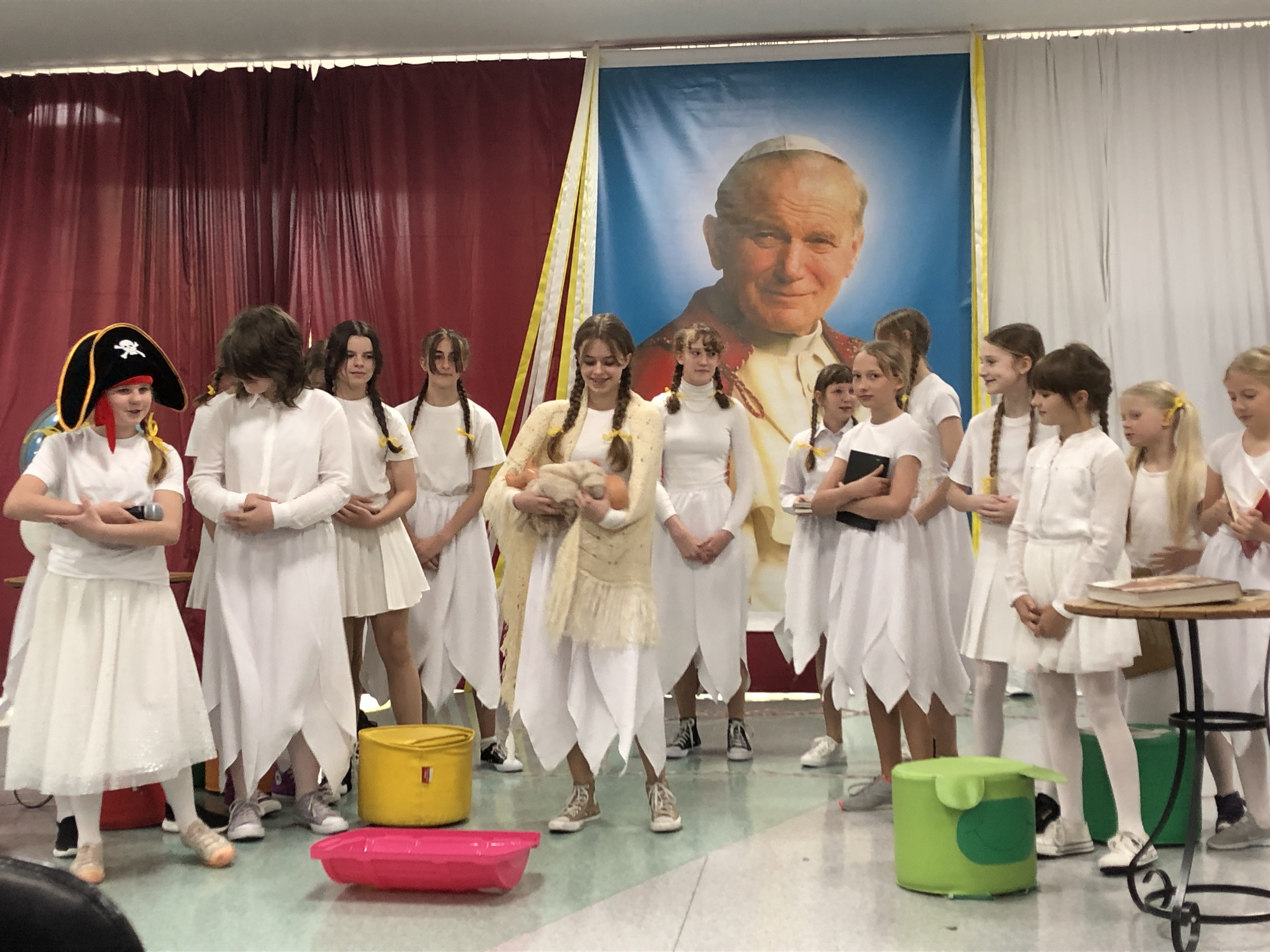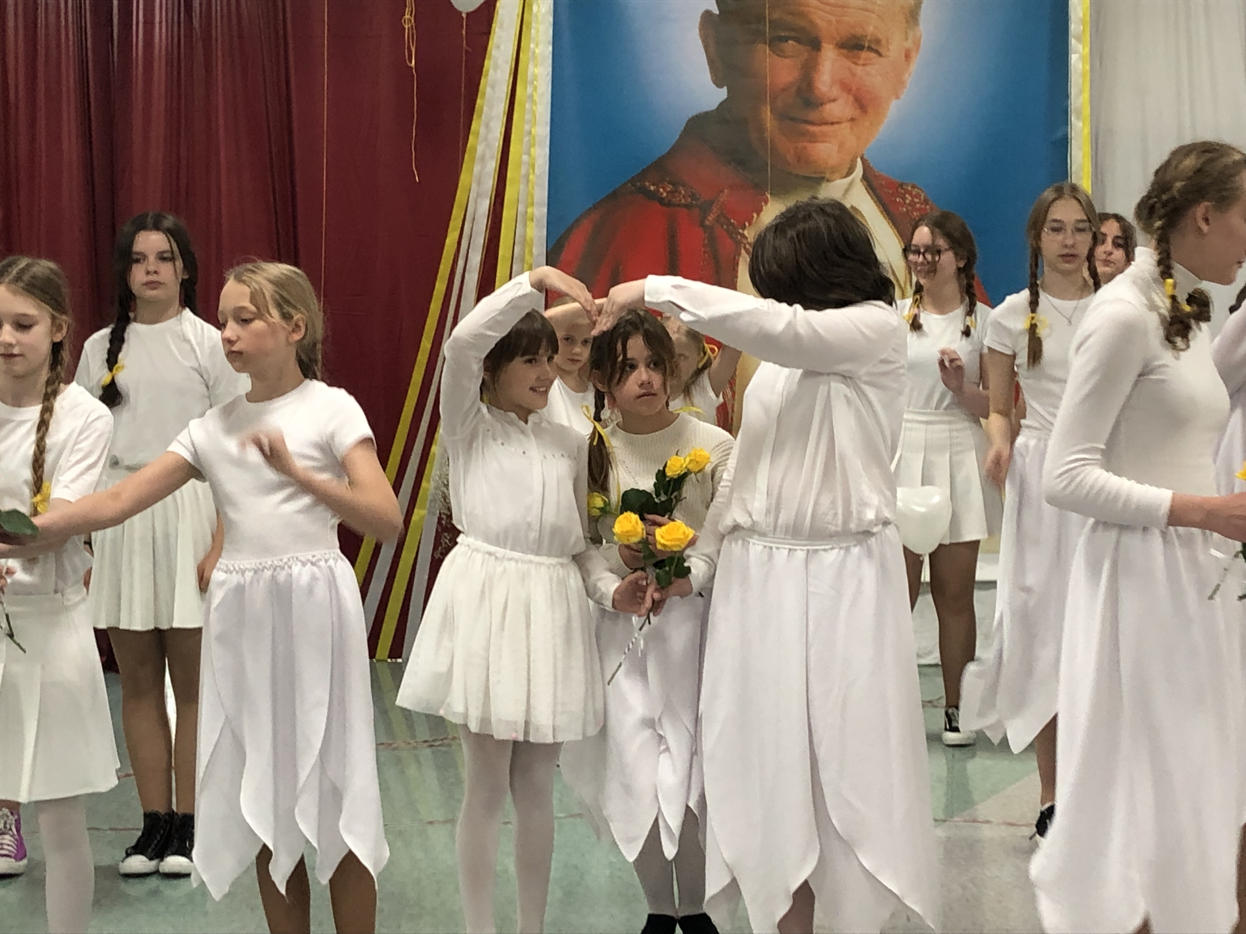 w Łodzi, ks. K. Glinianego-Proboszcza Parafii św. Wojciecha w Dobroniu, starszego aspiranta P. Draba-dzielnicowego, starszego aspiranta T. Lewandowskiego-dzielnicowego, p. M. Brachę- Przewodniczącą Rady Rodziców, na chwilę zadumy, refleksji i wspomnień o Karolu Wojtyle- Janie Pawle II. By uczcić Papieża, sterownika „ Łodzi Piotrowej przez 27 lat”, trzeba dobrać słowa, by prawdziwa była zawsze słów wymowa. O jego wielkości i pracy codziennej- etiuda „ Nasz skarb”, 19 maja 2023 roku opowieść snuła…
