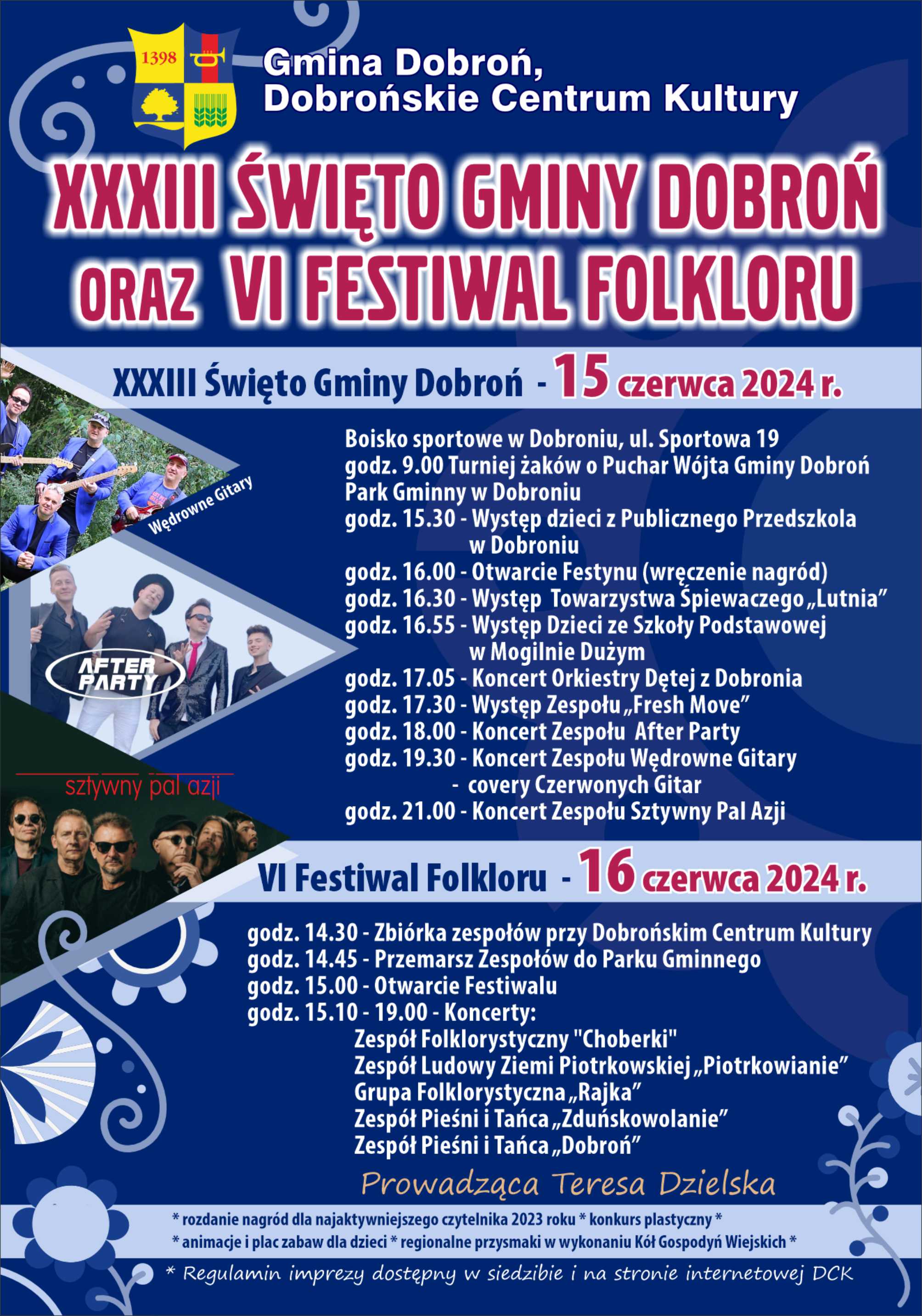 15 czerwca 2024 roku w Parku Gminnym w Dobroniu odbędzie się XXXIII Święto Gminy Dobroń. W programie imprezy znajdą się atrakcje dla dzieci, przygotowane przez Koła Gospodyń Wiejskich poczęstunki, występy dzieci z Przedszkola Gminnego i Szkoły Postawowej oraz zaproszonych zespołów.