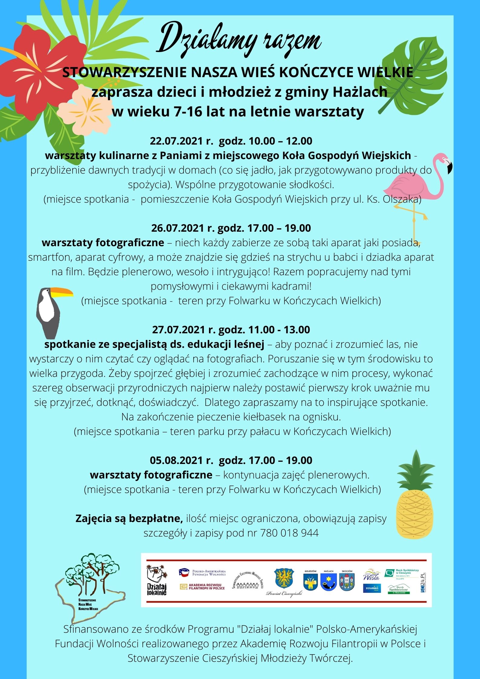 Plakat informujący, że Stowarzyszenie Nasza Wieś Kończyce Wielkie zaprasza dzieci i młodzież z gminy Hażlach w wieku 7-16 lat na letnie warsztaty. Zadanie sfinansowane ze środków Programu „Działaj lokalnie” Polsko-Amerykańskiej Fundacji Wolności realizowanego przez Akademię Rozwoju Filantropii w Polsce i Stowarzyszenie Cieszyńskiej Młodzieży Twórczej.