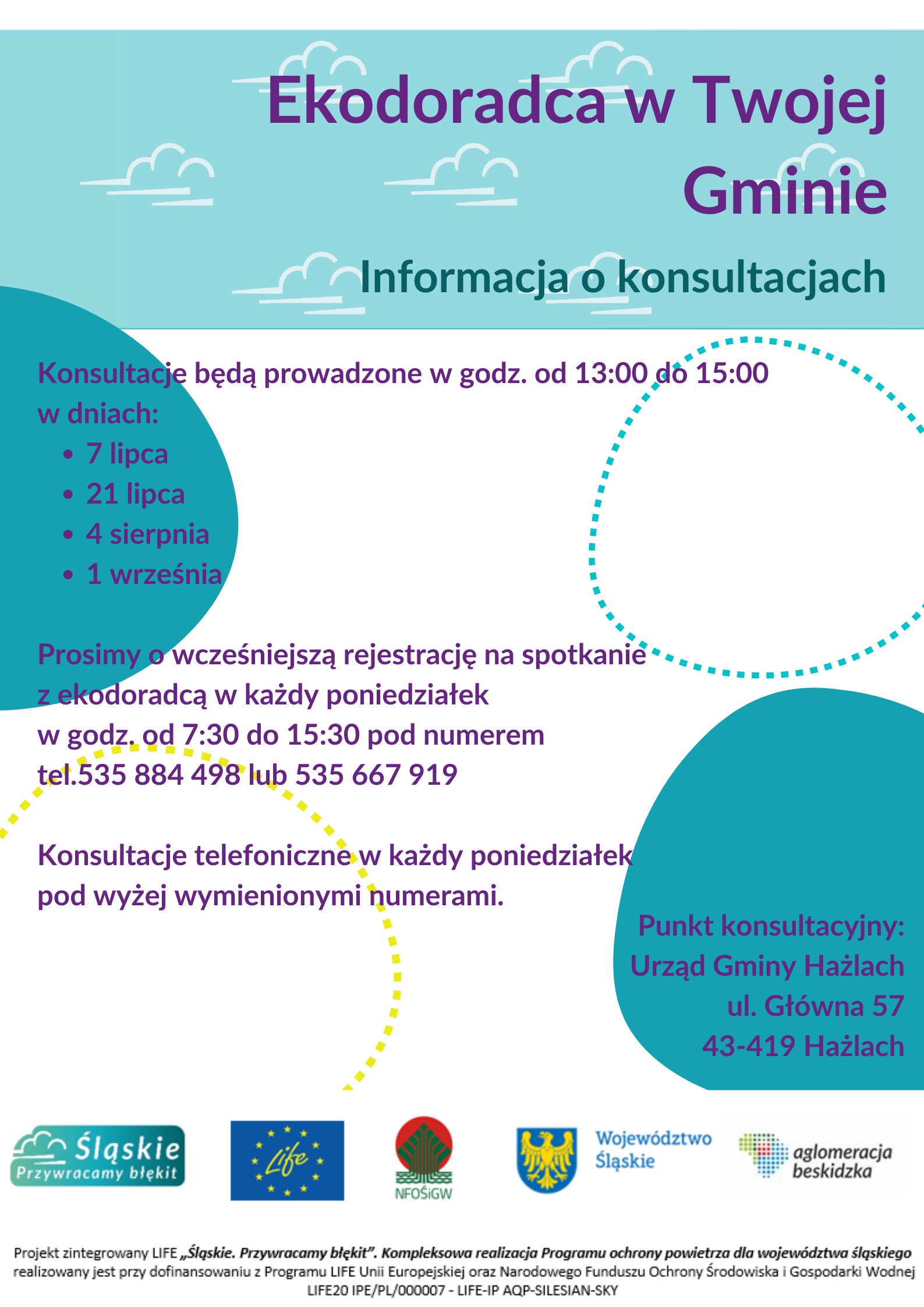 Konsultacje prowadzone będą w ramach projektu zintegrowanego LIFE „Śląskie. Przywracamy błękit”. Kompleksowa realizacja Programu ochrony powietrza dla województwa śląskiego, realizowanego przy dofinansowaniu z Programu LIFE Unii Europejskiej oraz Narodowego Funduszu Ochrony Środowiska i Gospodarki Wodnej, w godzinach od 13.00 do 15.00 w dniach: 7 lipca, 21 lipca, 4 sierpnia i 1 września 2022 roku. Bliższe informacje na poniższym plakacie.