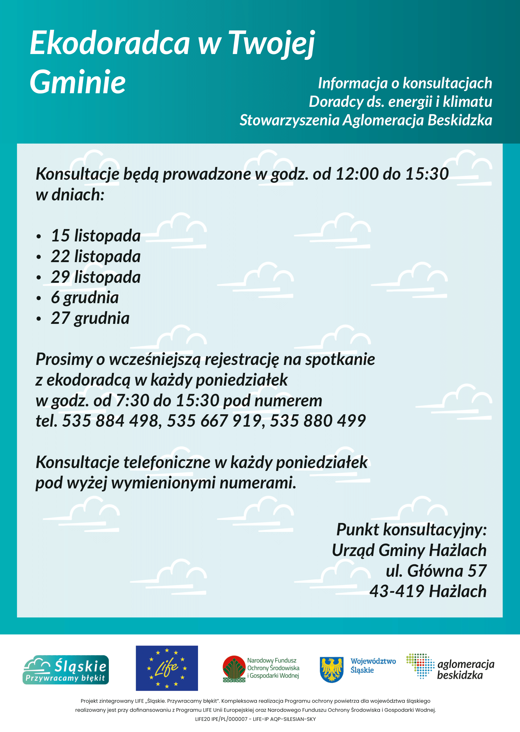Konsultacje prowadzone będą w ramach projektu zintegrowanego LIFE „Śląskie. Przywracamy błękit”. Kompleksowa realizacja Programu ochrony powietrza dla województwa śląskiego, realizowanego przy dofinansowaniu z Programu LIFE Unii Europejskiej oraz Narodowego Funduszu Ochrony Środowiska i Gospodarki Wodnej, w godzinach od 12.00 do 15.30 w dniach: 15 listopada, 22 listopada, 29 listopada, 6 grudnia, 27 grudnia 2023 roku. Bliższe informacje na poniższym plakacie.