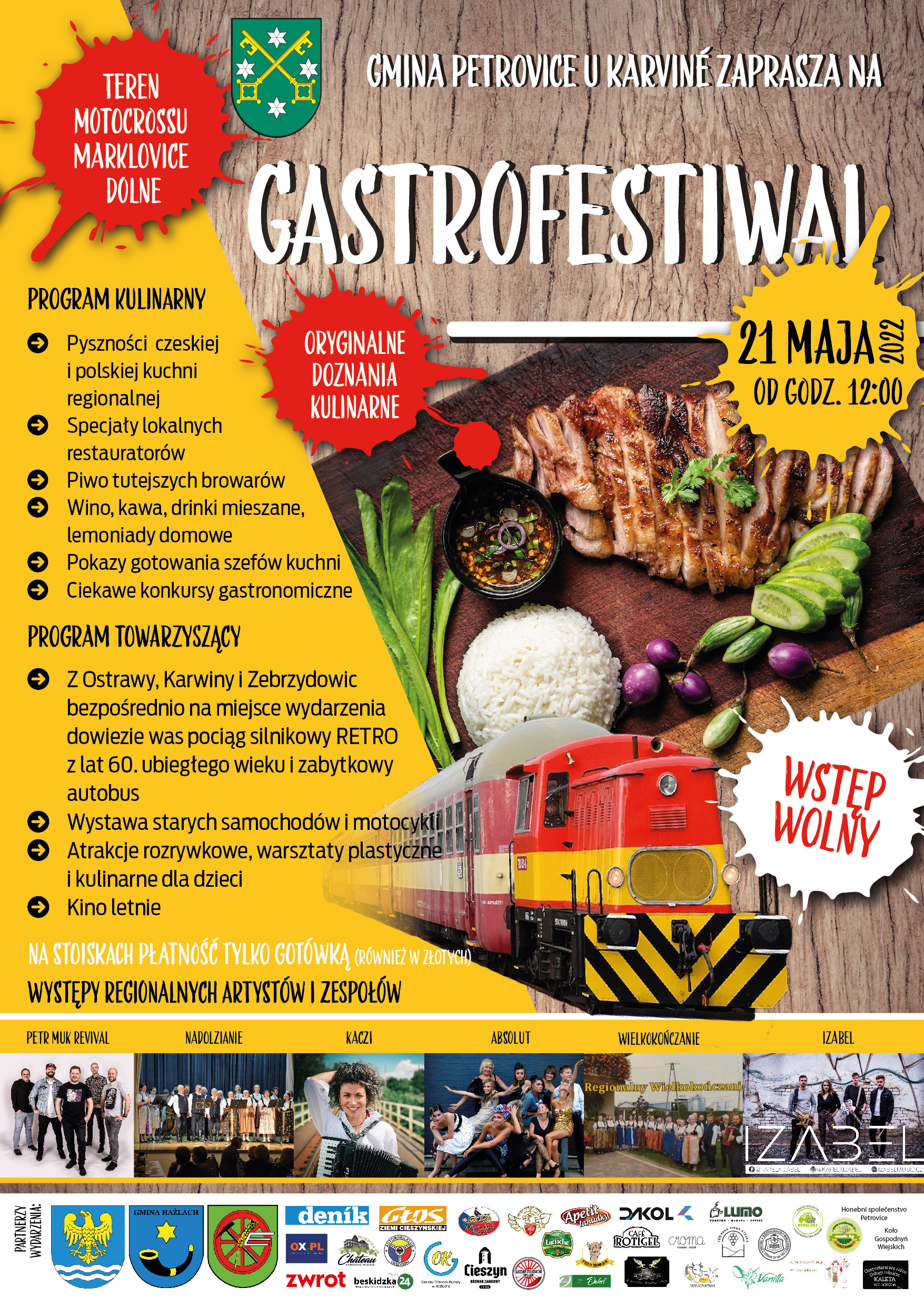 21 maja na terenie motocrossu w Marklowicach Dolnych w Republice Czeskiej odbędzie się „Gastrofestival”, impreza kulinarno-rozrywkowa organizowana przez Gminę Piotrowice k. Karwiny przy udziale Gmin Zebrzydowice i Hażlach. Początek o godzinie 12.00. W programie wiele czeskich i polskich pyszności do skosztowania oraz bogaty program towarzyszący. Wystąpią m.in. zespoły z Polski: „Nadolzianie” i „Wielkokończanie”. Z Ostrawy, Karwiny i Zebrzydowic będzie kursował specjalny retro-pociąg i zabytkowy autobus. Na imprezę wstęp wolny. Więcej szczegółów na poniższym plakacie.