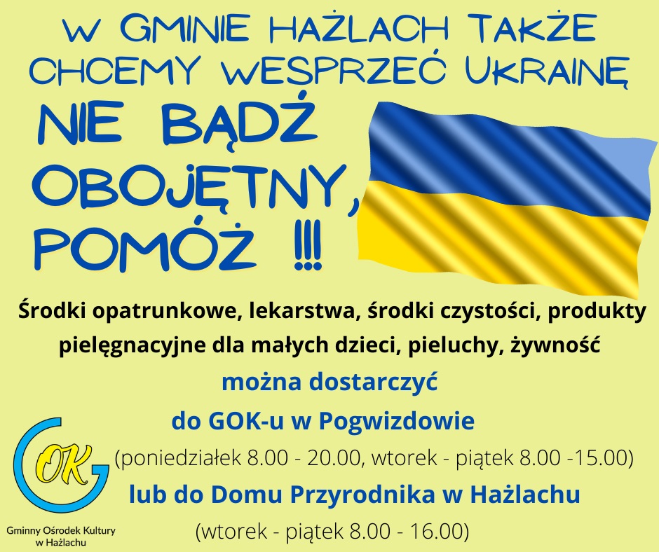 Chęć niesienia pomocy obywatelom Ukrainy w formie udzielenie schronienia (uwaga: zakwaterowanie może trwać nawet kilka miesięcy i wszelkie koszty na dzień dzisiejszy ponosi udzielający schronienia), pomocy materialnej, psychologicznej, medycznej, zapewnienia transportu, tłumaczeń itp. osoby dysponujące takimi możliwościami mogą zgłaszać na adres mailowy: ukraina@hazlach.pl.