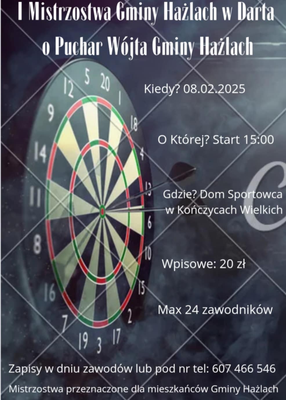 W sobotę 8 lutego 2025 r. w Domu Sportowca w Kończycach Wielkich zostaną rozegrane I Mistrzostwa w Darta o Puchar Wójta Gminy Hażlach. Początek o godz. 15.00. Zapisy w dniu zawodów lub pod podanym na plakacie numerem telefonu. Zachęcamy do udziału zainteresowanych mieszkańców Gminy Hażlach (liczba zawodników ograniczona do 24 osób). Dalsze szczegóły na zamieszczonym plakacie.