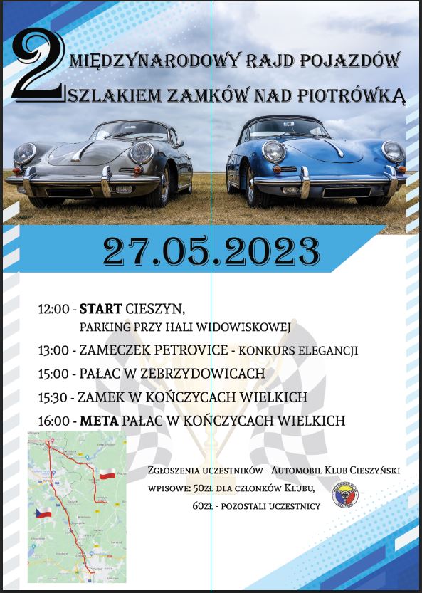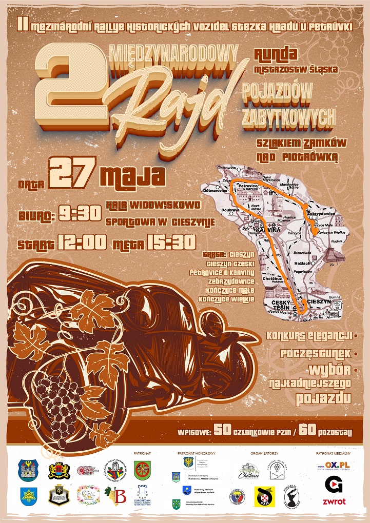 Organizatorzy odbywającego się pod honorowym patronatem Wójta Gminy Hażlach II Międzynarodowego Rajdu Pojazdów Zabytkowych „Szlakiem Zamków nad Piotrówką”, który odbędzie się w sobotę 27 maja, zapraszają na jego finał od godz. 15.30 na dziedzińcu pałacu w Kończycach Wielkich. Start w Cieszynie o godz. 12.00. Więcej informacji na poniższych plakatach.