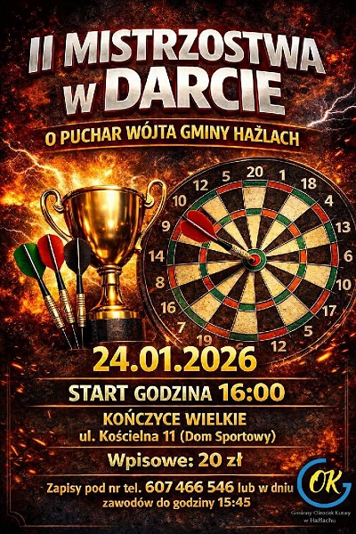 W sobotę 24 stycznia 2026 r. w Domu Sportowca w Kończycach Wielkich zostaną rozegrane II Mistrzostwa w Darcie o Puchar Wójta Gminy Hażlach. Impreza rozpocznie się o godz. 16.00. Zapisy pod podanym na plakacie numerem telefonu lub bezpośrednio u organizatorów w dniu zawodów.