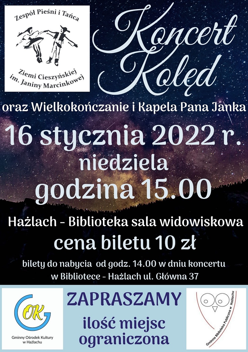 Gminny Ośrodek Kultury i Biblioteka Publiczna w Hażlachu zapraszają na Koncert Kolęd w wykonaniu Zespołu Pieśni i Tańca Ziemi Cieszyńskiej im. Janiny Marcinkowej, który odbędzie się w sali widowiskowej Gminnej Biblioteki Publicznej w Hażlachu (ul. Główna 37) w niedzielę 16 stycznia o godzinie 15.00. Wezmą w nim udział także zespoły z naszej Gminy – „Wielkokończanie” oraz „Kapela Pana Janka” z Pogwizdowa.