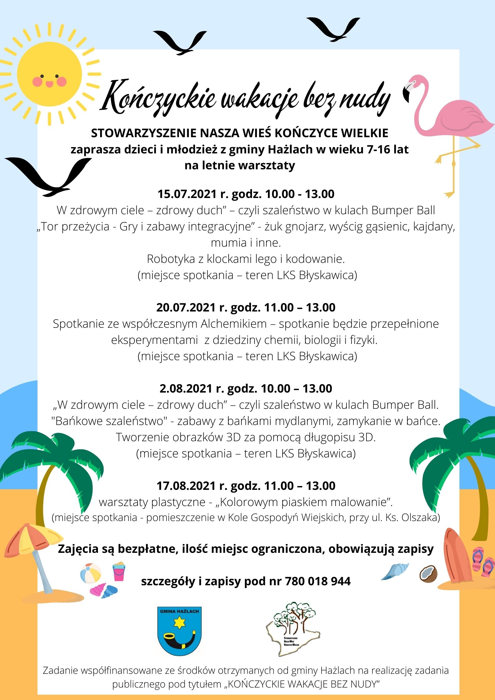 Stowarzyszenie Nasza Wieś Kończyce Wielkie zaprasza dzieci i młodzież z gminy Hażlach w wieku 7-16 lat na letnie warsztaty. Zadanie współfinansowane ze środków otrzymanych od gminy Hażlach na realizację zadania publicznego pod tytułem „Kończyckie wakacje bez nudy”.