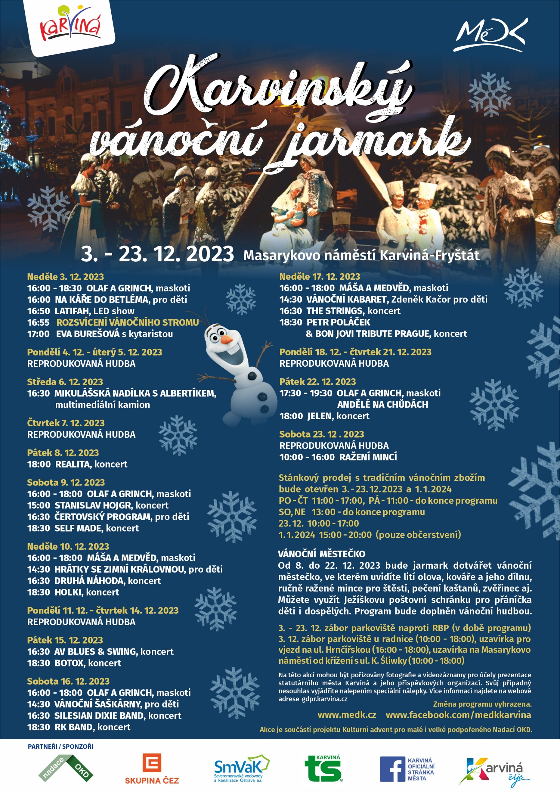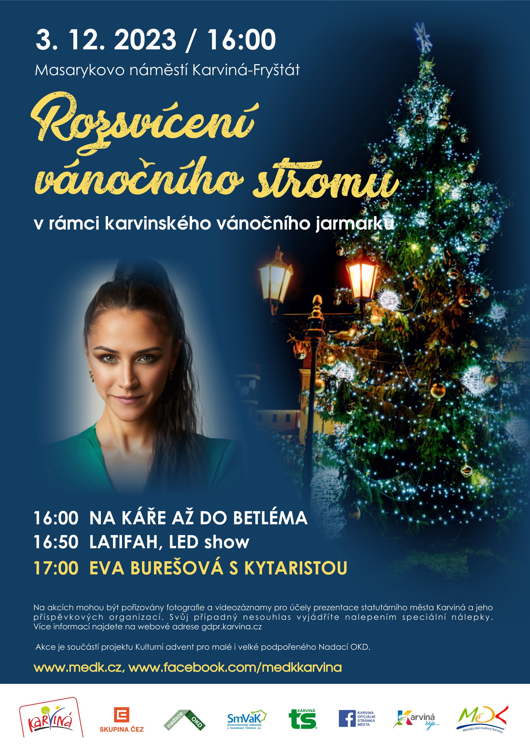 Miasto Karwina zaprasza na wydarzenia organizowane w dniach od 3 do 23 grudnia bieżącego roku w ramach projektu „Kulturalny adwent dla młodszych i starszych”: „Karwiński jarmark bożonarodzeniowy” i rozpoczynające go "Rozświetlenie choinki bożonarodzeniowej". Szczegóły na poniższych plakatach.