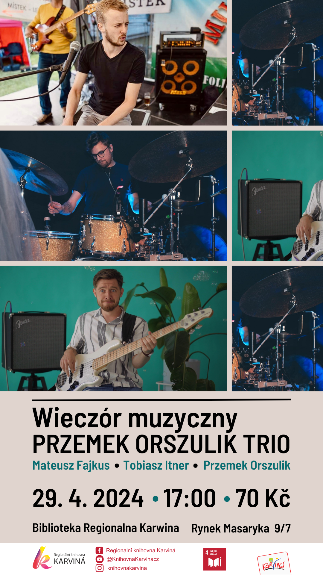Biblioteka Regionalna w Karwinie zaprasza na wieczór muzyczny grupy „Przemek Orszulik Trio”. Impreza odbędzie się 29 kwietnia 2024 r. na Rynku Masaryka 9/7. Początek o godzinie 17.00.