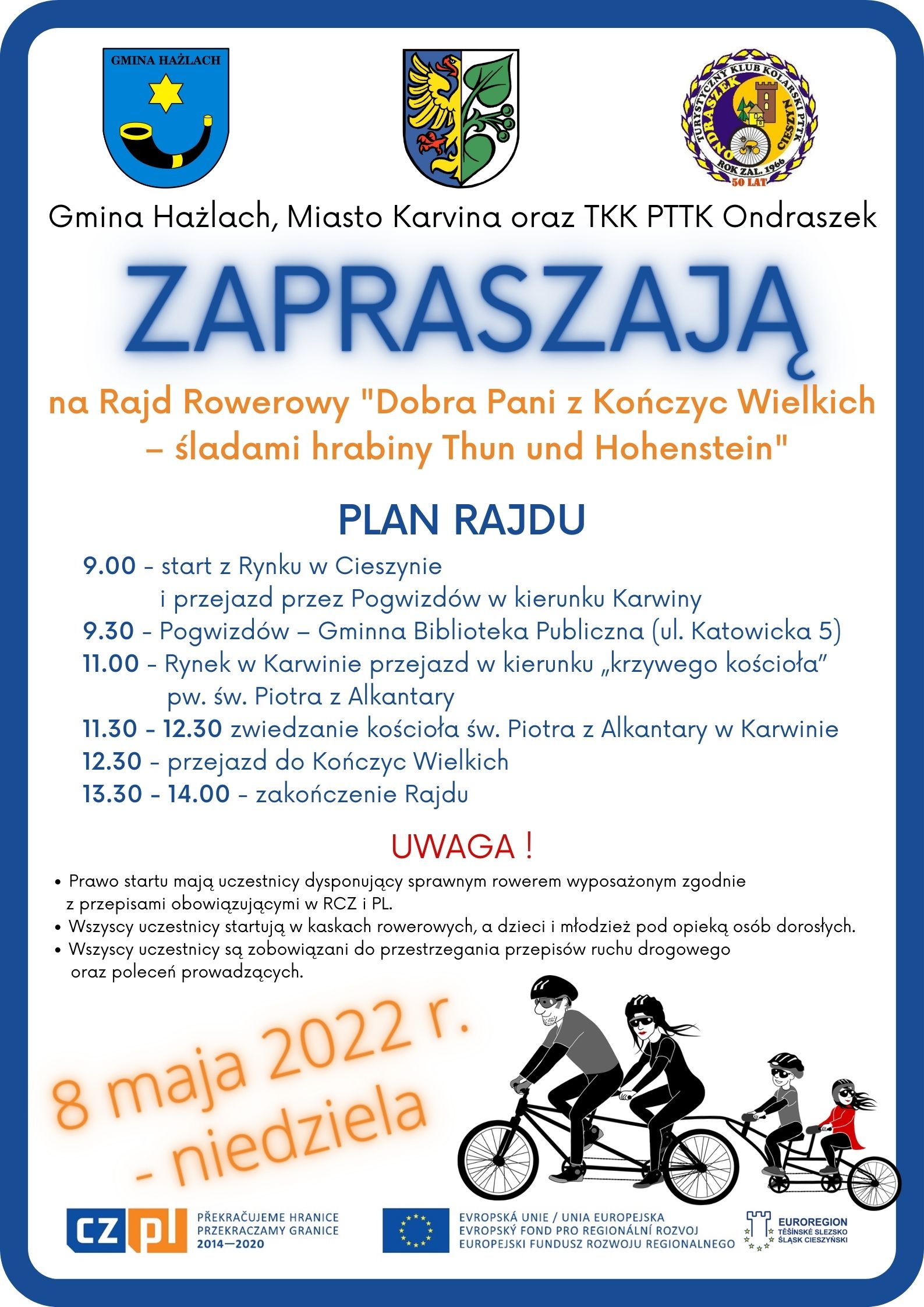 Gmina Hażlach, Miasto Karwina oraz Turystyczny Klub Kolarski PTTK „Ondraszek” zapraszają w niedzielę 8 maja br. na Rajd Rowerowy „Dobra Pani z Kończyc Wielkich – śladami hrabiny Thun und Hohenstein”. Start o godz. 9.00 z Rynku w Cieszynie, następnie przejazd przez Pogwizdów w kierunku Karwiny. Zakończenie rajdu w godz. 13.30 – 14.00. Bliższe informacje na poniższym plakacie.