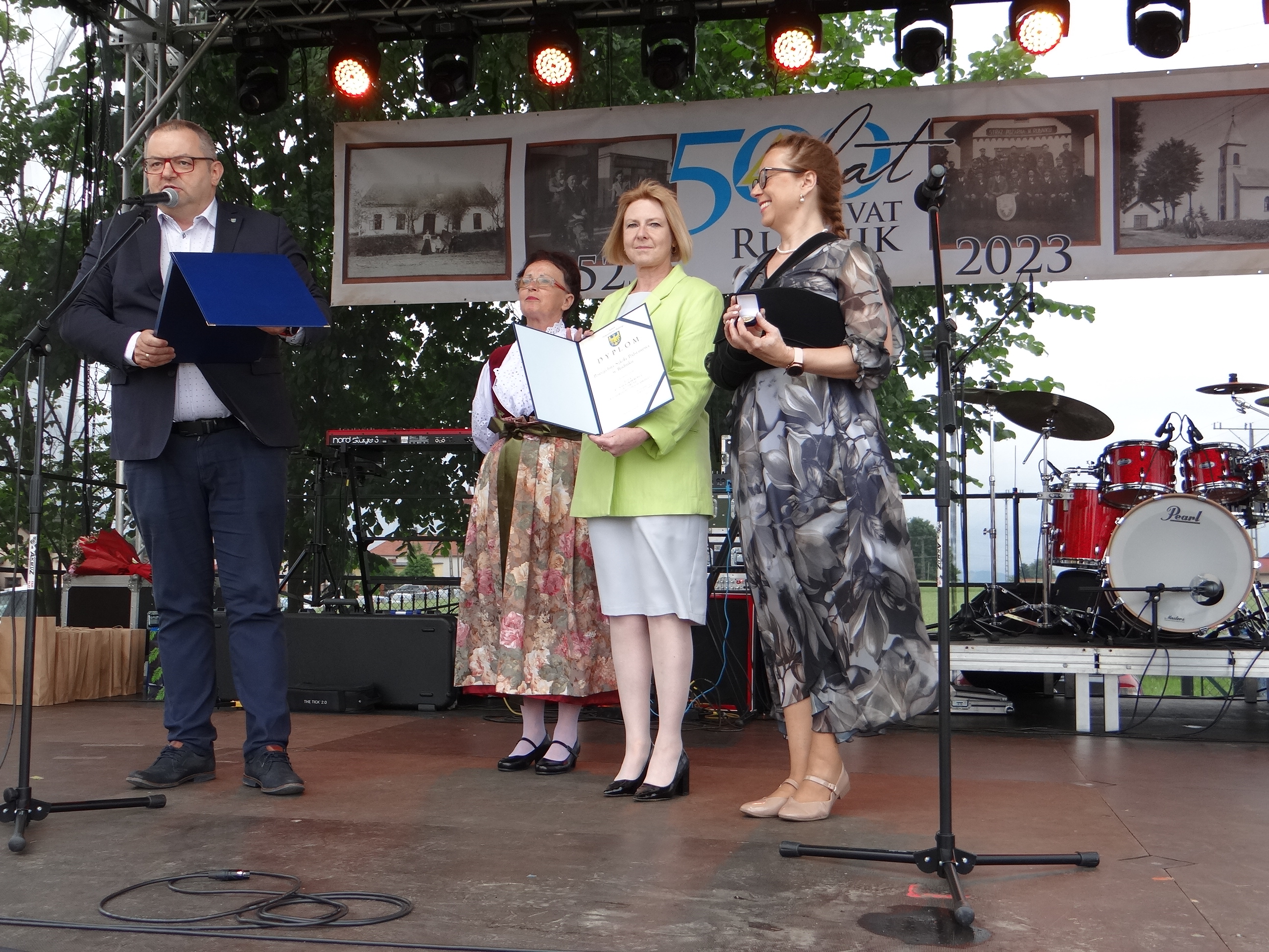 Ważnym momentem uroczystości było przekazanie rudnickiej Powszechnej Szkole Podstawowej Złotej Odznaki Honorowej za Zasługi dla Województwa Śląskiego, którą z rąk przedstawiciela samorządu Województwa Śląskiego K. Klimosza odebrały wspólnie Dyrektor Szkoły Beata Starzyk, stojąca na czele jej organu prowadzącego, czyli Stowarzyszenia na Rzecz Rozwoju Wsi Rudnik w Rudniku, Prezes Sylwia Grzebień oraz Sołtys Rudnika Urszula Lebioda. Jednocześnie gość z Katowic odczytał list gratulacyjny od Marszałka Województwa Śląskiego Jakuba Chełstowskiego.