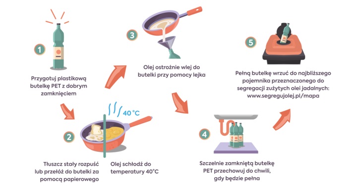 Po smażeniu należy poczekać, aż tłuszcz przestygnie, a następnie, np. przy pomocy lejka, przelać do plastikowej butelki (np. po wodzie, mleku, detergentach). Pełną butelkę należy wyrzucić do specjalnego pojemnika do segregacji zużytego oleju i tłuszczu, w kolorze czarnym z pomarańczowym wiekiem.