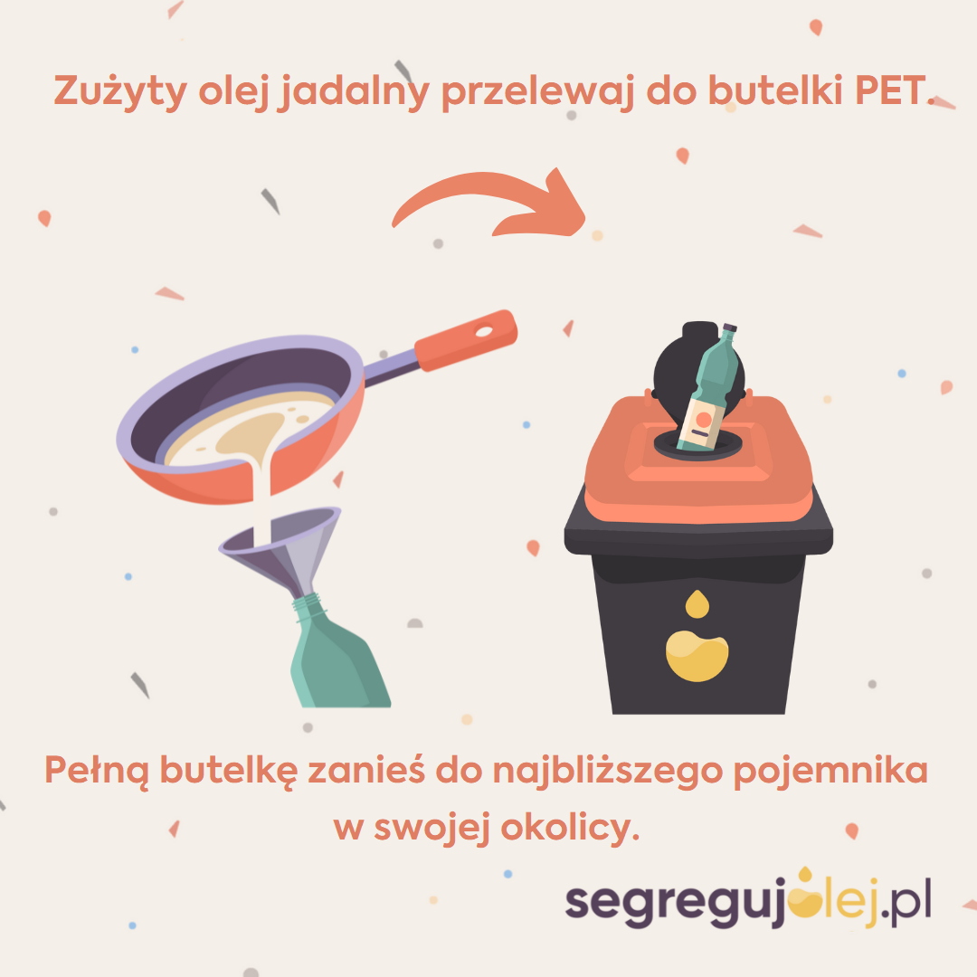 Jak segregować olej? Przygotuj pustą butelkę PET, np. po wodzie czy mleku. Olej ostrożnie przelej do butelki, użyj lejka i papierowego ręcznika dla bezpieczeństwa. Następnie szczelnie zakręć butelkę i schowaj np. pod zlew. Butelkę napełniaj stopniowo, a dopiero, gdy będzie pełna, wrzuć ją do najbliższego pojemnika na zużyte oleje i tłuszcze w swojej okolicy. Znajdziesz go na mapie: www.segregujolej.pl/mapa/.