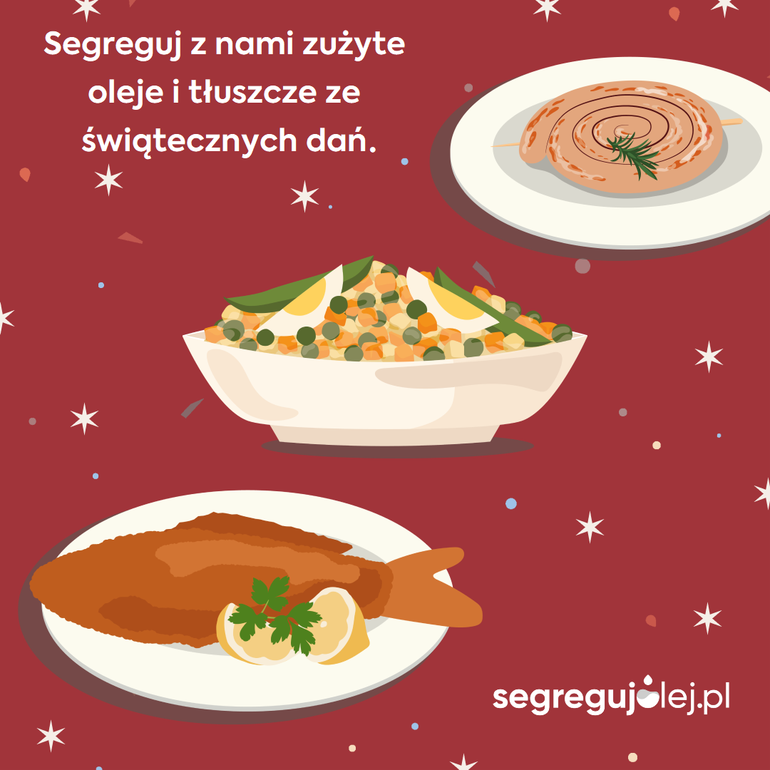 Świąteczny stół obfituje w wiele dań, w wielu domach królują tradycyjne potrawy, inni serwują je w nowoczesnej odsłonie. Jednak w większości przypadków święta nie mogą obejść się bez oleju i tłuszczu w kuchni. Co więcej, zużywa się go w ciągu tych kilku dni tyle samo, co przez cały roku. Dlatego w tym czasie ważna jest segregacja zużytych olejów i tłuszczów, żeby nie szkodziły sieciom kanalizacyjnym i mogły zostać wykorzystane ponownie.
