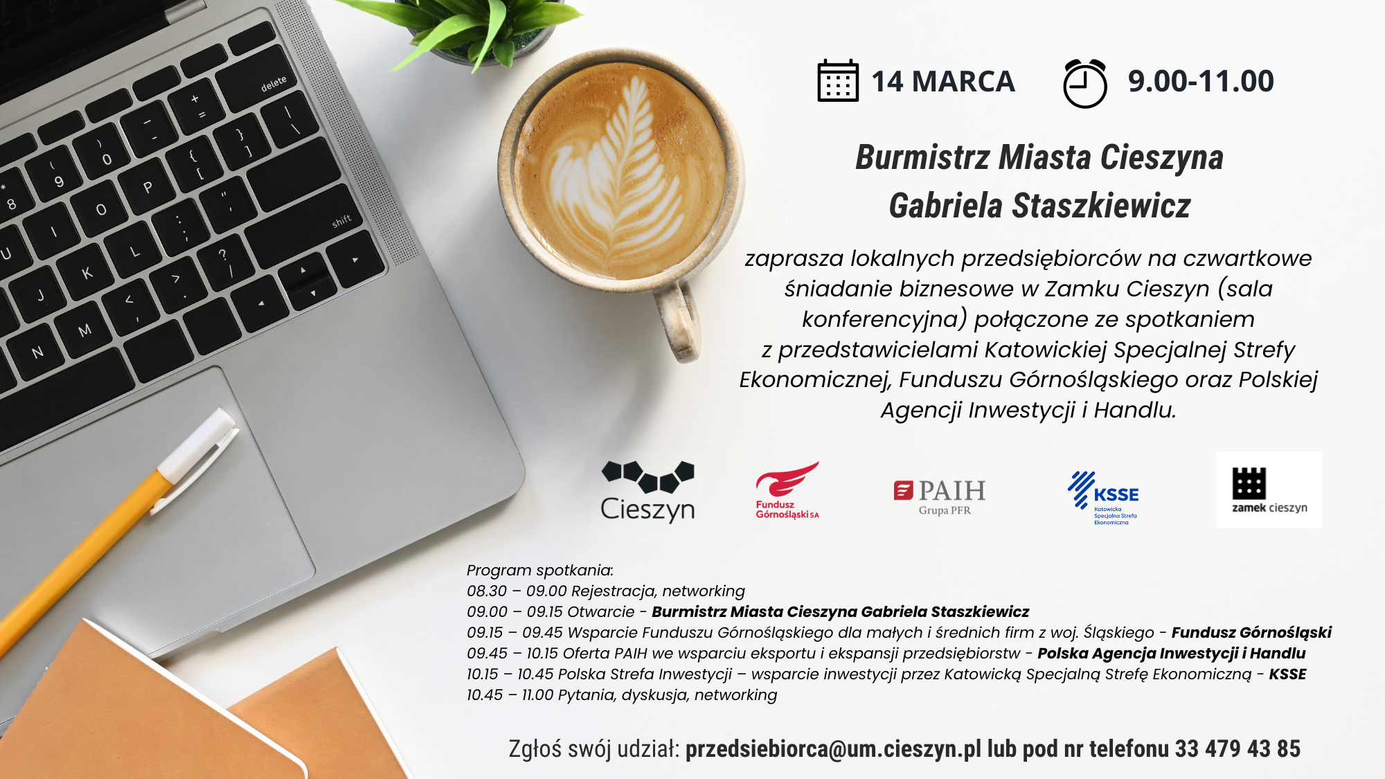 Z uwagi na ograniczoną liczbę miejsc organizatorzy proszą o potwierdzenie udziału na adres przedsiebiorca@um.cieszyn.pl lub poprzez formularz zgłoszeniowy.