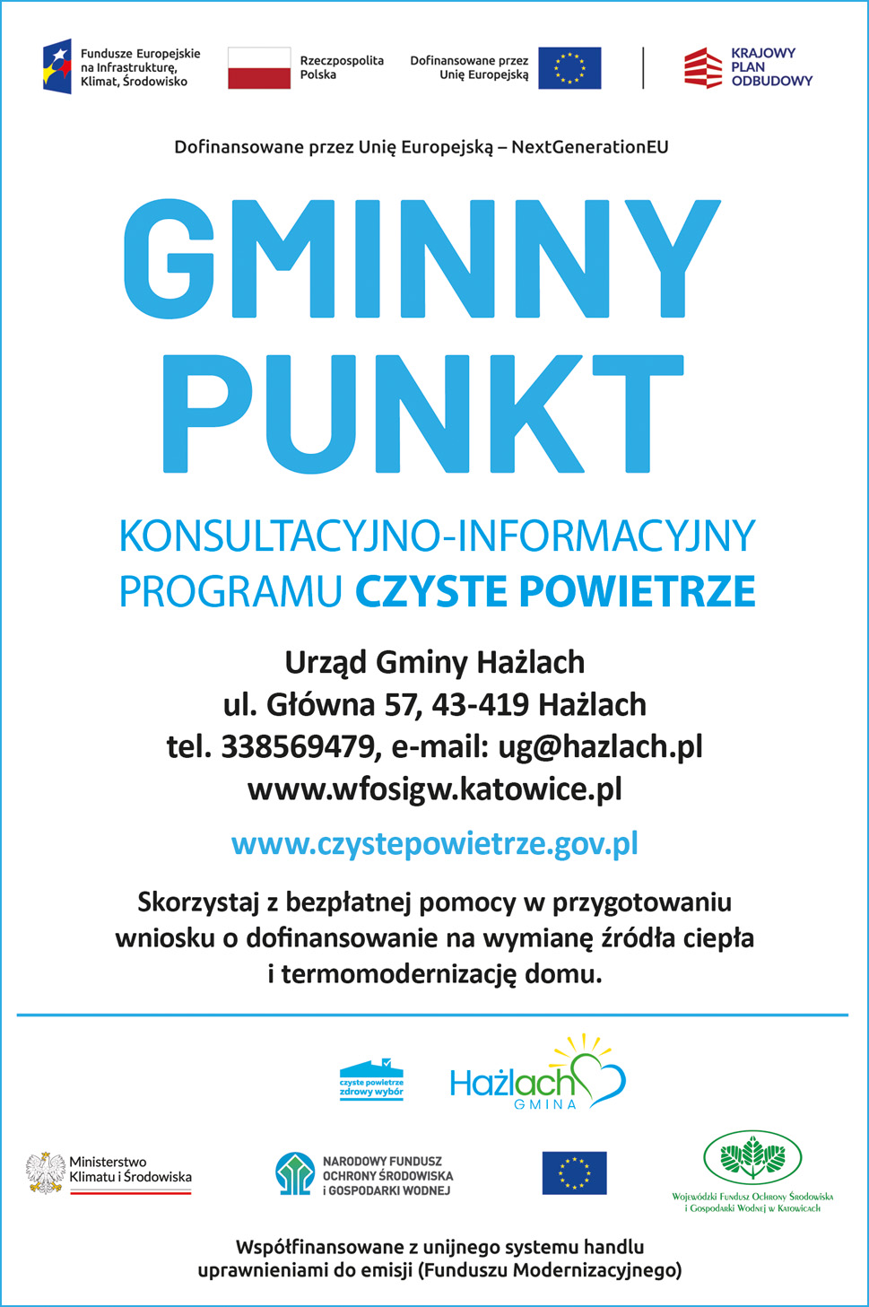 Jednocześnie informujemy, że Gmina Hażlach zawarła porozumienie z Wojewódzkim Funduszem Ochrony Środowiska i Gospodarki Wodnej w Katowicach i przystąpiła do obsługi Programu Priorytetowego „Czyste Powietrze”.