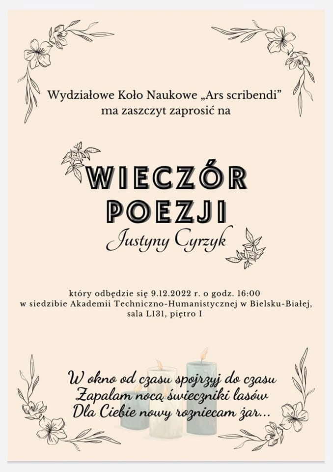 9 grudnia 2022 roku o godz. 16.00 w Akademii Techniczno-Humanistycznej w Bielsku-Białej odbędzie się wieczór poezji pochodzącej z Kończyc Wielkich Justyny Cyrzyk, studentki III roku filologii polskiej tej uczelni. Młoda poetka jest laureatką dwóch edycji Wojewódzkiego Przeglądu Dziecięcej i Młodzieżowej Twórczości Literackiej „LIPA” (2021, 2022), pisze wiersze oraz teksty piosenek do muzyki Mariusza Śniegulskiego. Więcej informacji tutaj.