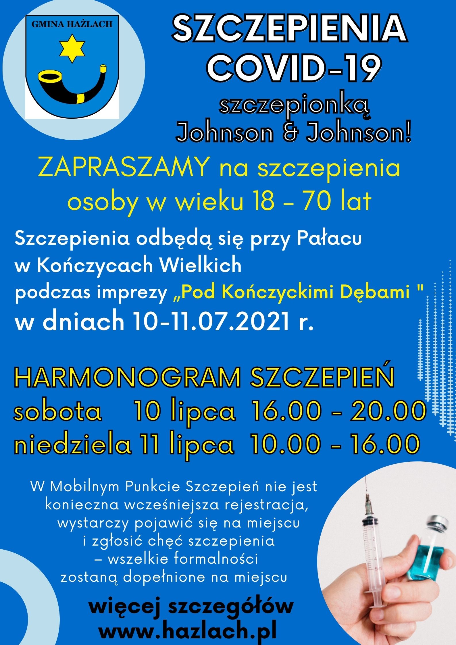 Urząd Gminy Hażlach informuje o możliwości zaszczepienia się osób pełnoletnich w wieku 18-70 lat dedykowaną, jednodawkową szczepionką Johnson & Johnson. Szczepienia odbędą się podczas imprezy „Pod kończyckimi dębami” w dniach 10-11 lipca 2021 roku.