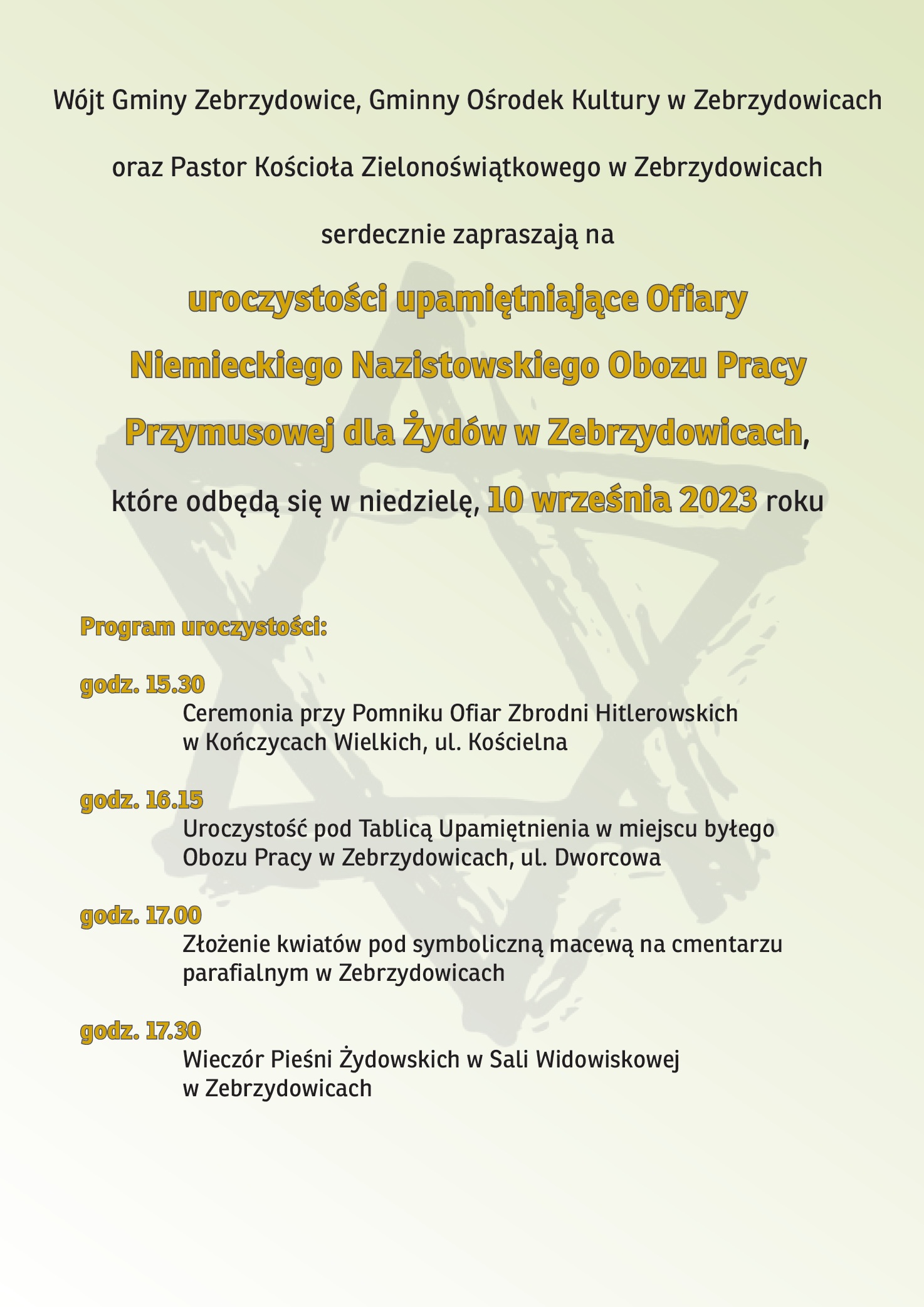Wójt Gminy Zebrzydowice, Gminny Ośrodek Kultury w Zebrzydowicach oraz Pastor Kościoła Zielonoświątkowego w Zebrzydowicach serdecznie zapraszają na uroczystości upamiętniające Ofiary Niemieckiego Nazistowskiego Obozu Pracy Przymusowej dla Żydów w Zebrzydowicach, które odbędą się w niedzielę, 10 września 2023r.