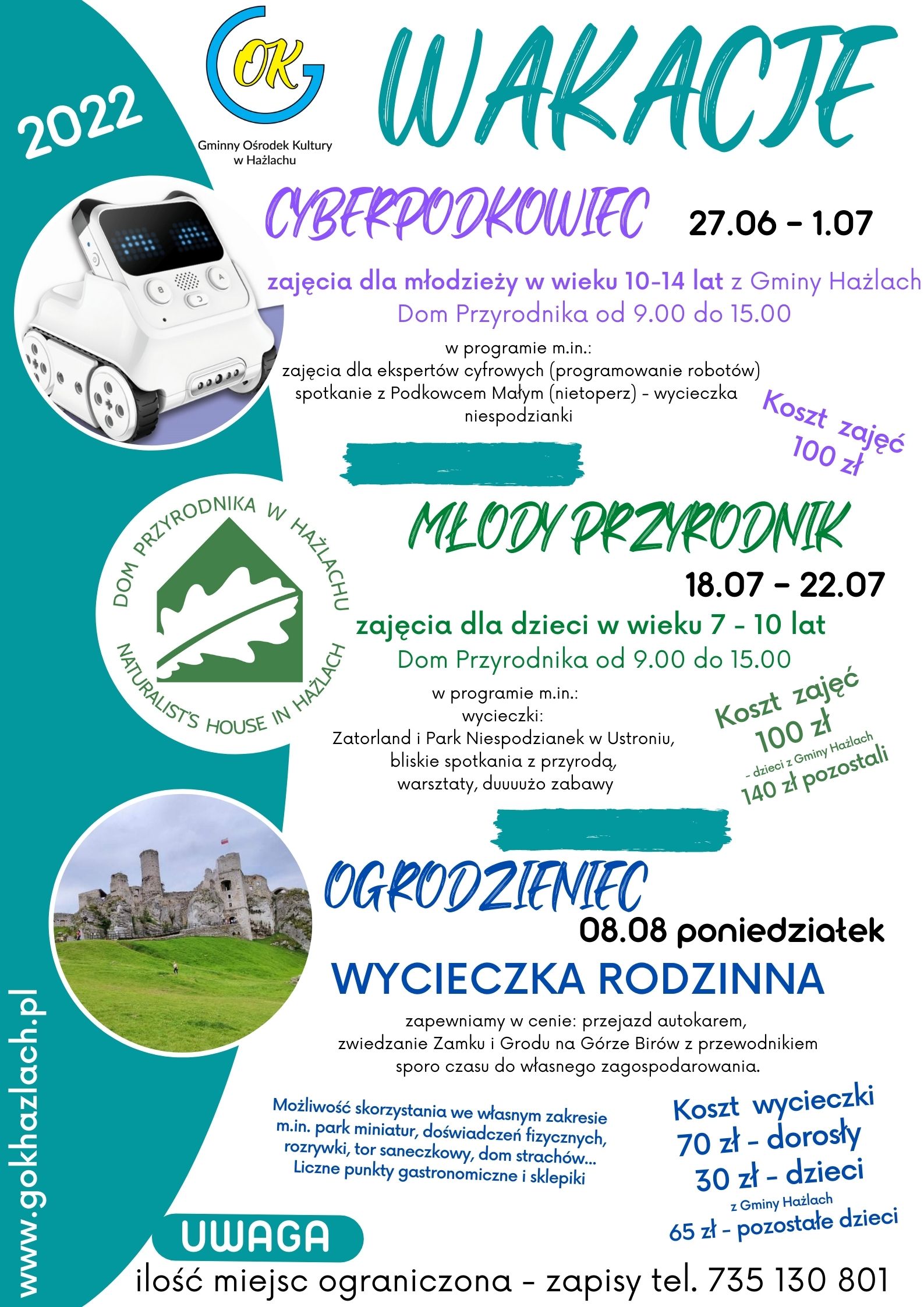 Gminny Ośrodek Kultury w Hażlachu zaprasza do skorzystania w najbliższe wakacje letnie z różnorodnej oferty. W tym roku przygotowano zajęcia skierowane do grupy młodszej i starszej oraz dla całych rodzin. Bliższe informacje na stronie internetowej GOK oraz na poniższym plakacie.