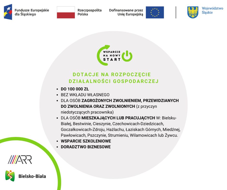 Projekt daje możliwości uzyskania dotacji na założenie działalności gospodarczej mieszkańcom lub osobom pracującym na terenie miejscowości: Bielsko-Biała, Bestwina, Cieszyn, Czechowice-Dziedzice, Goczałkowice-Zdrój, Hażlach, Łaziska Górne, Miedźna, Pawłowice, Pszczyna, Strumień, Wilamowice, Zebrzydowice, Żywiec, zagrożonym, przewidzianym do zwolnienia lub zwolnionym (w okresie po 28 maja 2021 r.) z przyczyn niedotyczących pracownika.