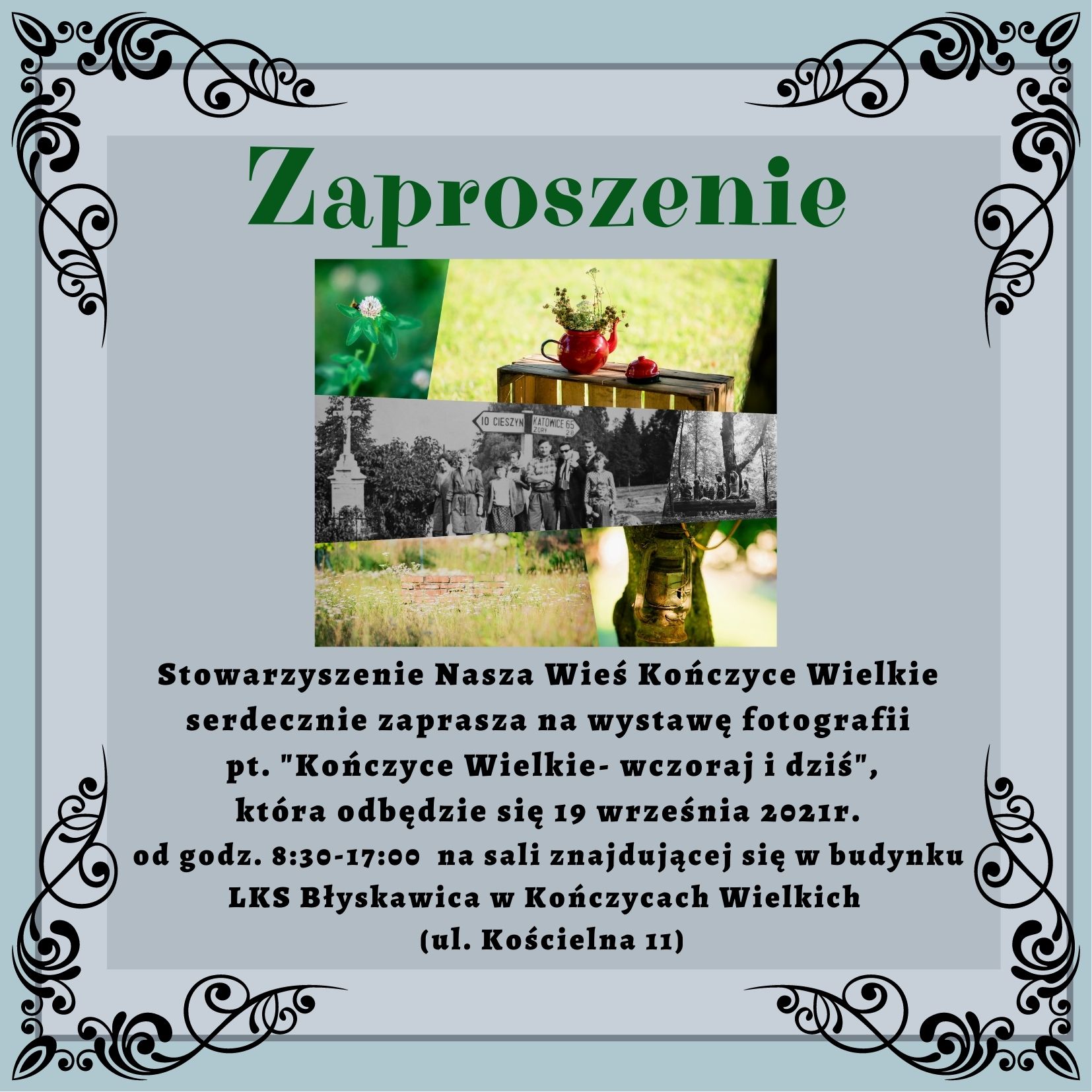Stowarzyszenie Nasza Wieś Kończyce Wielkie serdecznie zaprasza na wystawę fotografii pod tytułem „Kończyce Wielkie – wczoraj i dziś”. W niedzielę 19 września bieżącego roku w godzinach od 8.30 do 17.00 w budynku miejscowego Ludowego Klubu Sportowego „Błyskawica” przy ulicy Kościelnej będzie można obejrzeć prace uczestników warsztatów fotograficznych, które odbyły się podczas tegorocznych wakacji.