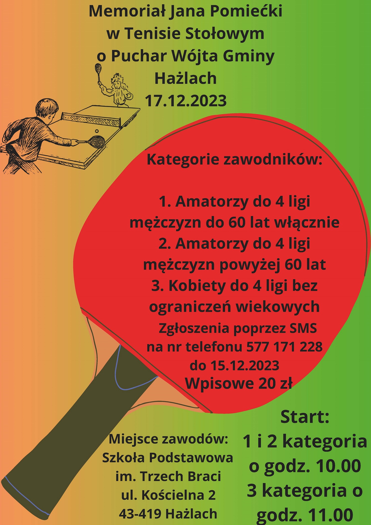 17 grudnia 2023 roku w sali sportowej Szkoły Podstawowej im. Trzech Braci w Hażlachu już po raz kolejny zostanie rozegramy Memoriał Jana Pomiećki w Tenisie Stołowym o Puchar Wójta Gminy Hażlach. Będzie on przeznaczony dla zawodników-amatorów, kobiet i mężczyzn, biorących udział w rozgrywkach do 4 ligi włącznie. Zgłoszenia chętnych można przesyłać na podany na poniższym plakacie numer telefonu. Początek zawodów o godzinie 10.