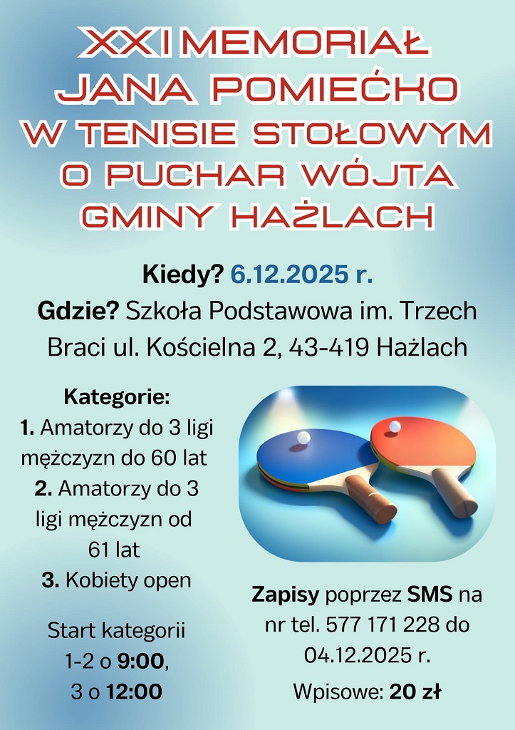 6 grudnia w sali sportowej Szkoły Podstawowej im. Trzech Braci w Hażlachu przy ul. Kościelnej 2 zostanie rozegrany XXI Memoriał Jana Pomiećki w Tenisie Stołowym o Puchar Wójta Gminy Hażlach. Zawody są skierowane do zawodników-amatorów: kobiet (kategoria open) i mężczyzn (kategorie do 60 lat i od 61 lat), biorących udział w rozgrywkach do 3 ligi włącznie. Zgłoszenia chętnych można przesyłać poprzez SMS na podany na poniższym plakacie numer telefonu do dnia 4 grudnia. Początek imprezy o godzinie 9.00.